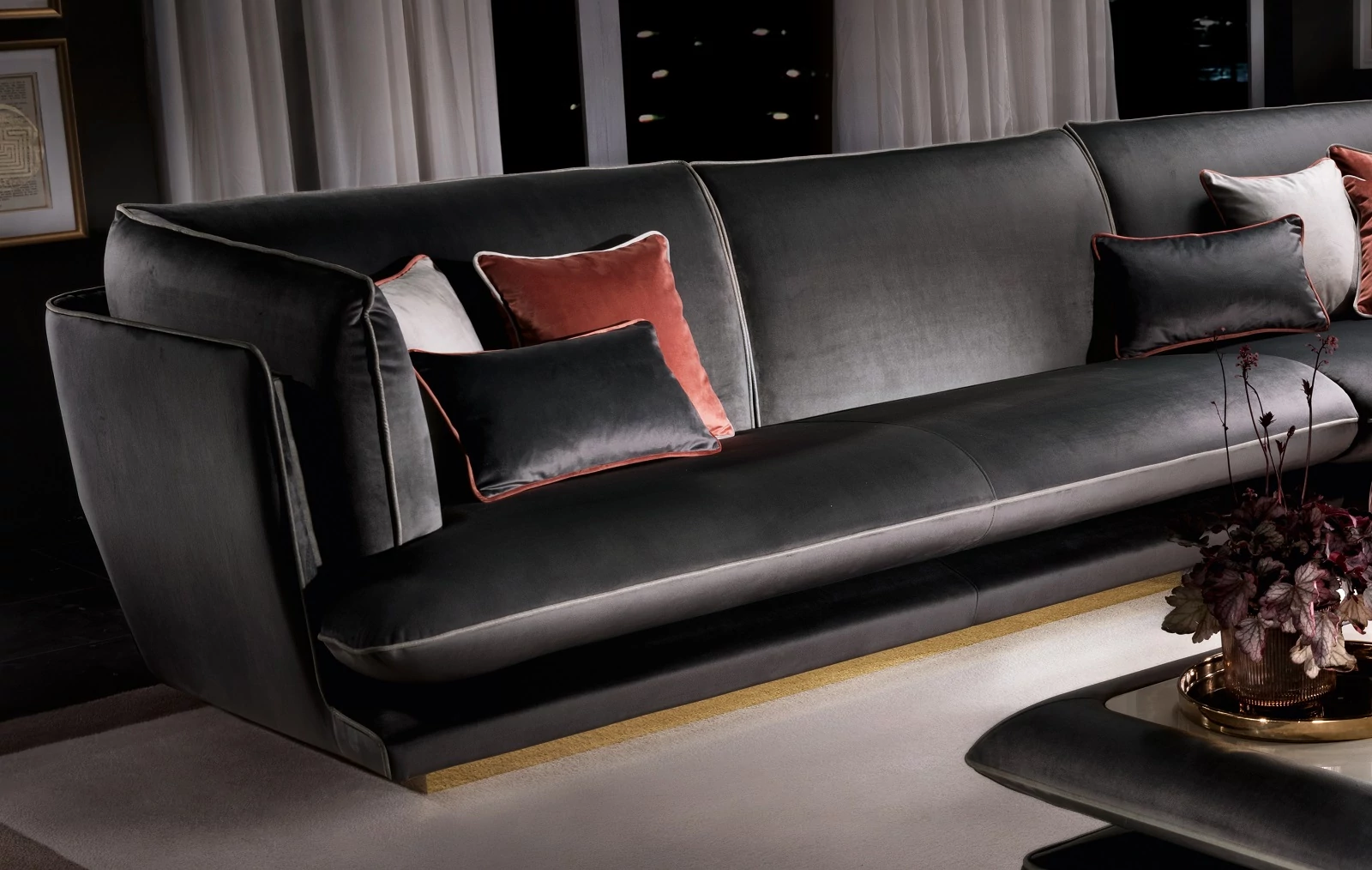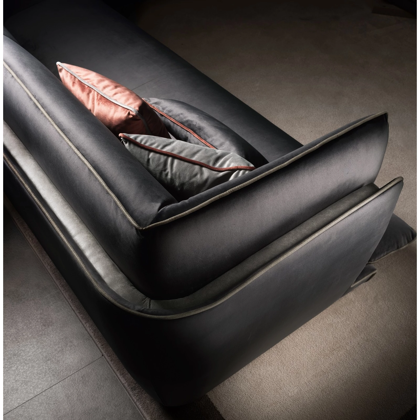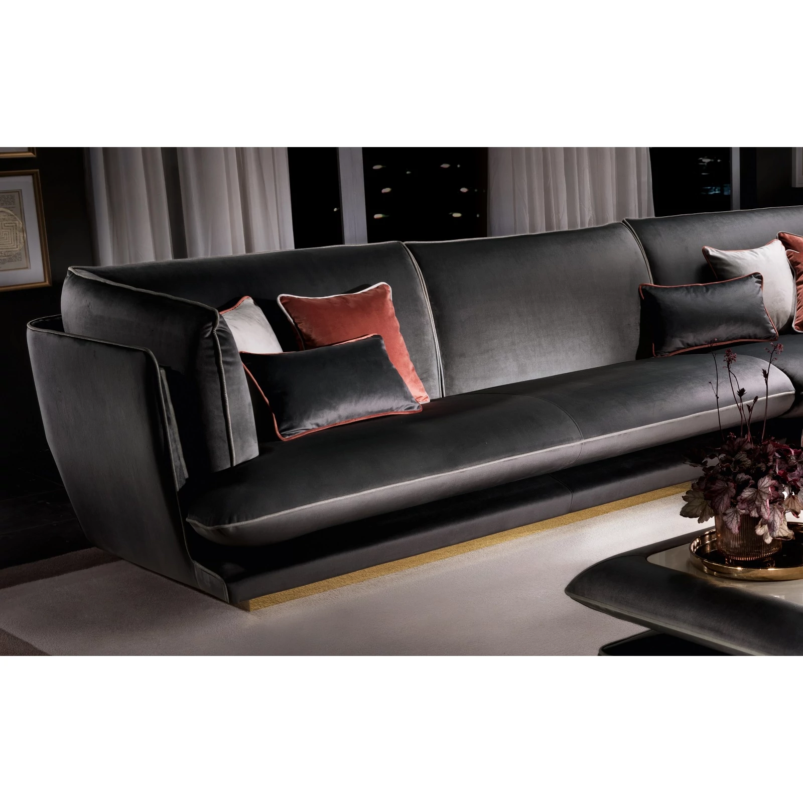 A kanapék és fotelek külső burkolata teljesen körülöleli a puha belső párnázatot, kiemelve az elemek különböző méreteit és az anyagok puhaságát, valamint az ülőrész formáját és kényelmességét. A széleket kontrasztos szövetből felvarrt szegélyek díszítik, melyek színe az anyagminták közül kiválasztva személyre szabható. Alsó részüket fényes fém lábazat szegélyezi, ezzel egy kis ragyogást kölcsönözve a bútordaraboknak, ami mindenki tekintetét odacsábítja.