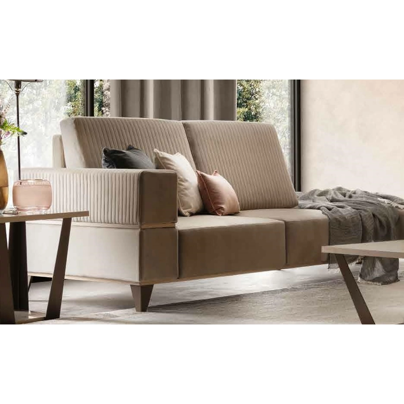 Az ArredoClassic Adora termékcsaládjának új kollekciója, az Ambra nappali-, étkező- és hálószobabútorokat is tartalmaz. Ez az utánozhatatlan modern stílusú bútorcsalád az olasz ízlést a maga teljes eleganciájában tükrözi. Az anyagok kontrasztja és a különböző felületek közötti méretbeli különbségek valódi jellemet kölcsönöznek minden egyes bútordarabnak. Kifinomult részletek jellemzik, amelyeket nem lehet nem észrevenni. A szilfából készült bútorok oldalsó lapjai elegánsan ellensúlyozzák az ajtók és fiókok márványos felületét, ezt pedig a szatén-bronz színű fogantyúk és lábak egészítik ki, igazán kifinomult módon. A bútordarabokon látható apró részletek, valamint az üvegfelületek tükröződései valódi ékszerként csillannak meg, ezzel fényességet kölcsönözve az egész garnitúrának. Ezeknek az esztétikai jellemzőknek köszönhetően a kollekció bármilyen környezetbe remekül illeszkedik. A márványos felületek csillogó hatása az asztallapon is visszaköszön, melynek szélei bronz színű anyaggal vannak keretezve, ami kiemeli a bútordarab körvonalait.