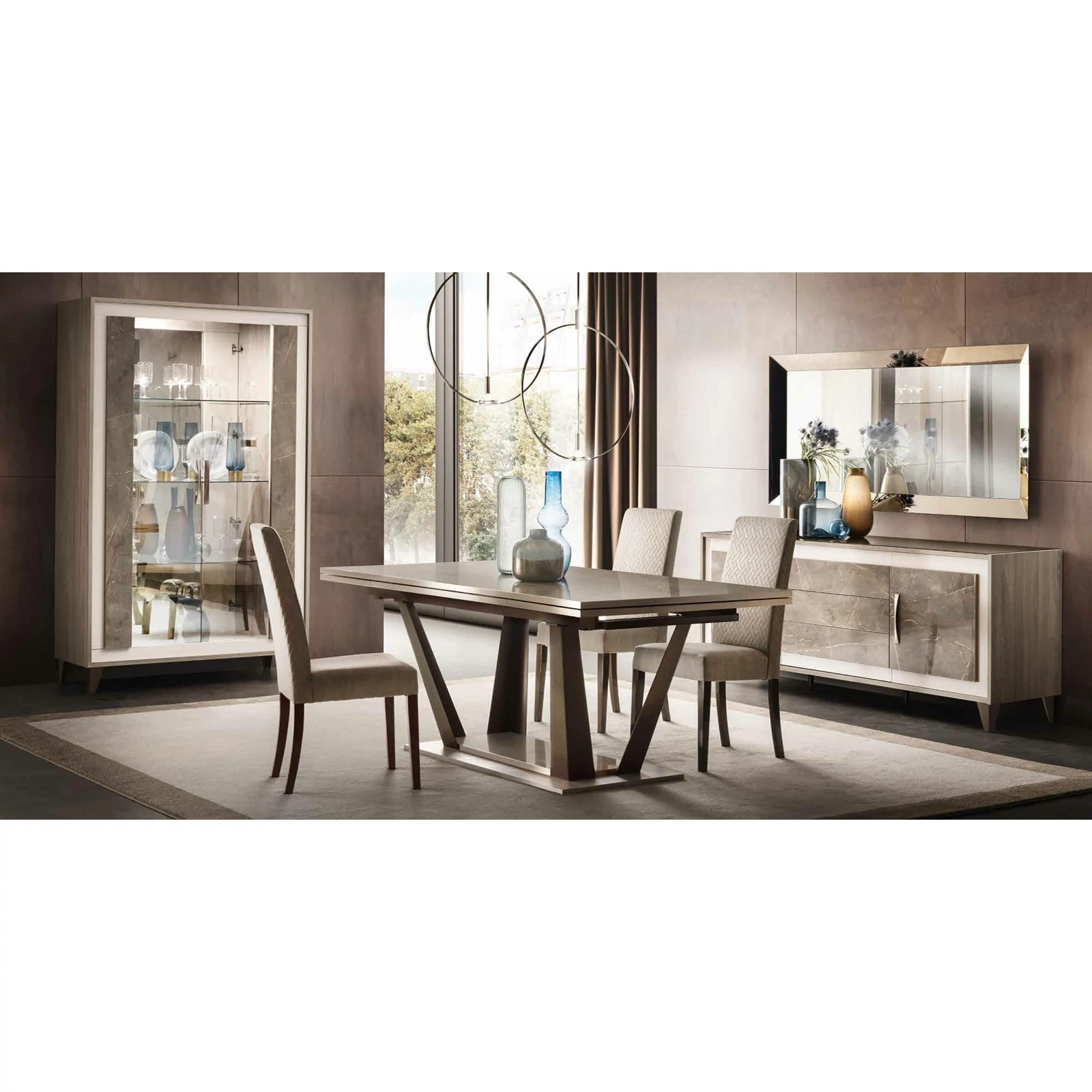 Az ArredoClassic Adora termékcsaládjának új kollekciója, az Ambra nappali-, étkező- és hálószobabútorokat is tartalmaz. Ez az utánozhatatlan modern stílusú bútorcsalád az olasz ízlést a maga teljes eleganciájában tükrözi. Az anyagok kontrasztja és a különböző felületek közötti méretbeli különbségek valódi jellemet kölcsönöznek minden egyes bútordarabnak. Kifinomult részletek jellemzik, amelyeket nem lehet nem észrevenni. A szilfából készült bútorok oldalsó lapjai elegánsan ellensúlyozzák az ajtók és fiókok márványos felületét, ezt pedig a szatén-bronz színű fogantyúk és lábak egészítik ki, igazán kifinomult módon. A bútordarabokon látható apró részletek, valamint az üvegfelületek tükröződései valódi ékszerként csillannak meg, ezzel fényességet kölcsönözve az egész garnitúrának. Ezeknek az esztétikai jellemzőknek köszönhetően a kollekció bármilyen környezetbe remekül illeszkedik. A márványos felületek csillogó hatása az asztallapon is visszaköszön, melynek szélei bronz színű anyaggal vannak keretezve, ami kiemeli a bútordarab körvonalait.
