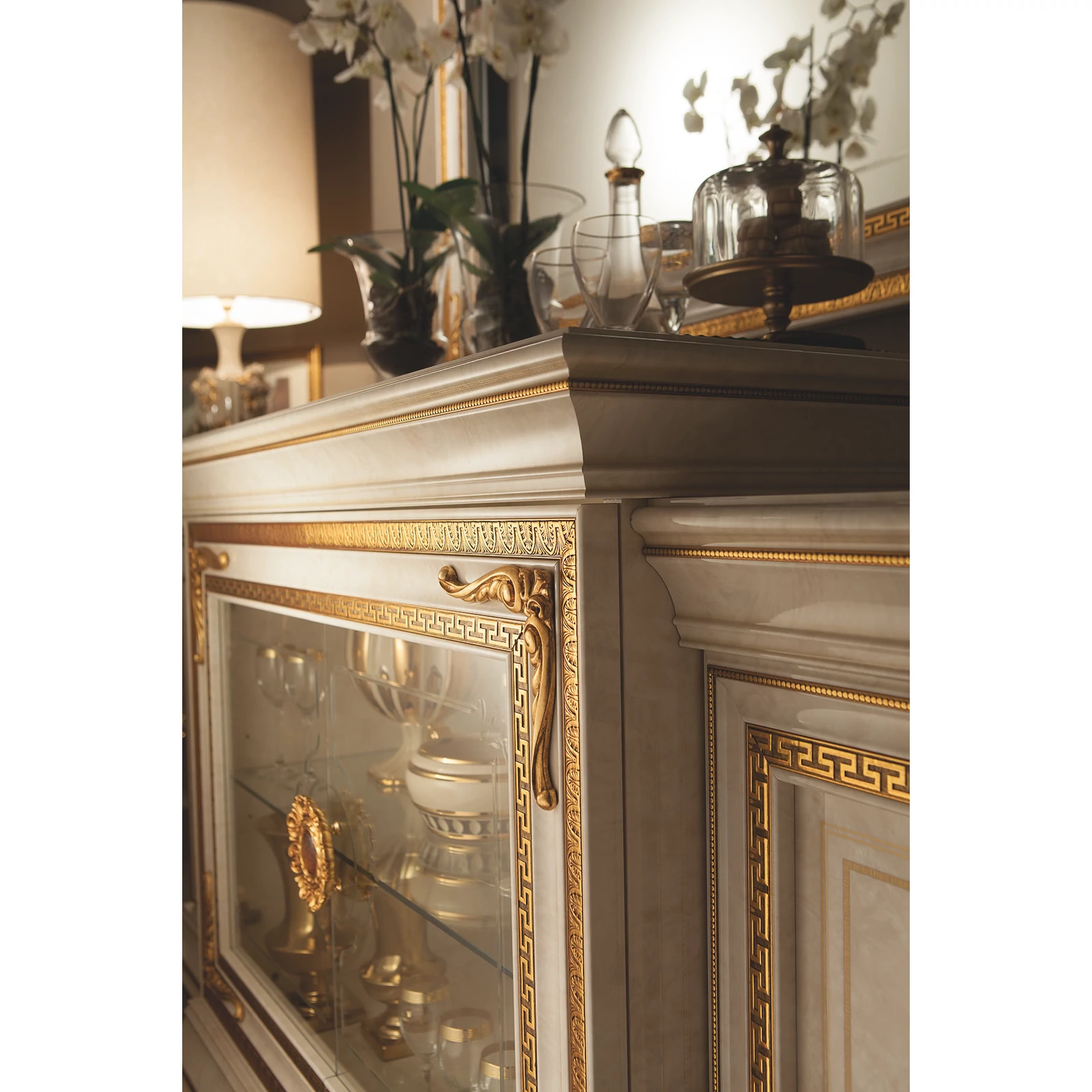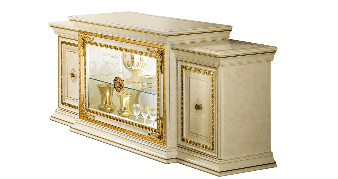A Leonardo olasz étkező és nappali garnitúra minden elemén megfigyelhetjük, ahogy a szobába áramló fény megcsillan a gyönyörűen díszített, aranyszínű felületeken. A márvány csillogását tükröző nagy felületeket csak ezek a mesteri díszítések törik meg. Az ArredoClassic gyár kiváló mesterei olyan remekművet alkottak, melynek luxus hangulatát együtt élvezheti családjával és barátaival. Vitrinjei, tükrei akár egy extra aranyszínű, antikolt díszkoronával is kiegészíthetők - válogassa össze ponsotan azt a garnitúrát, amelyre Önnek van szüksége és rendezze be vele szobáit!
