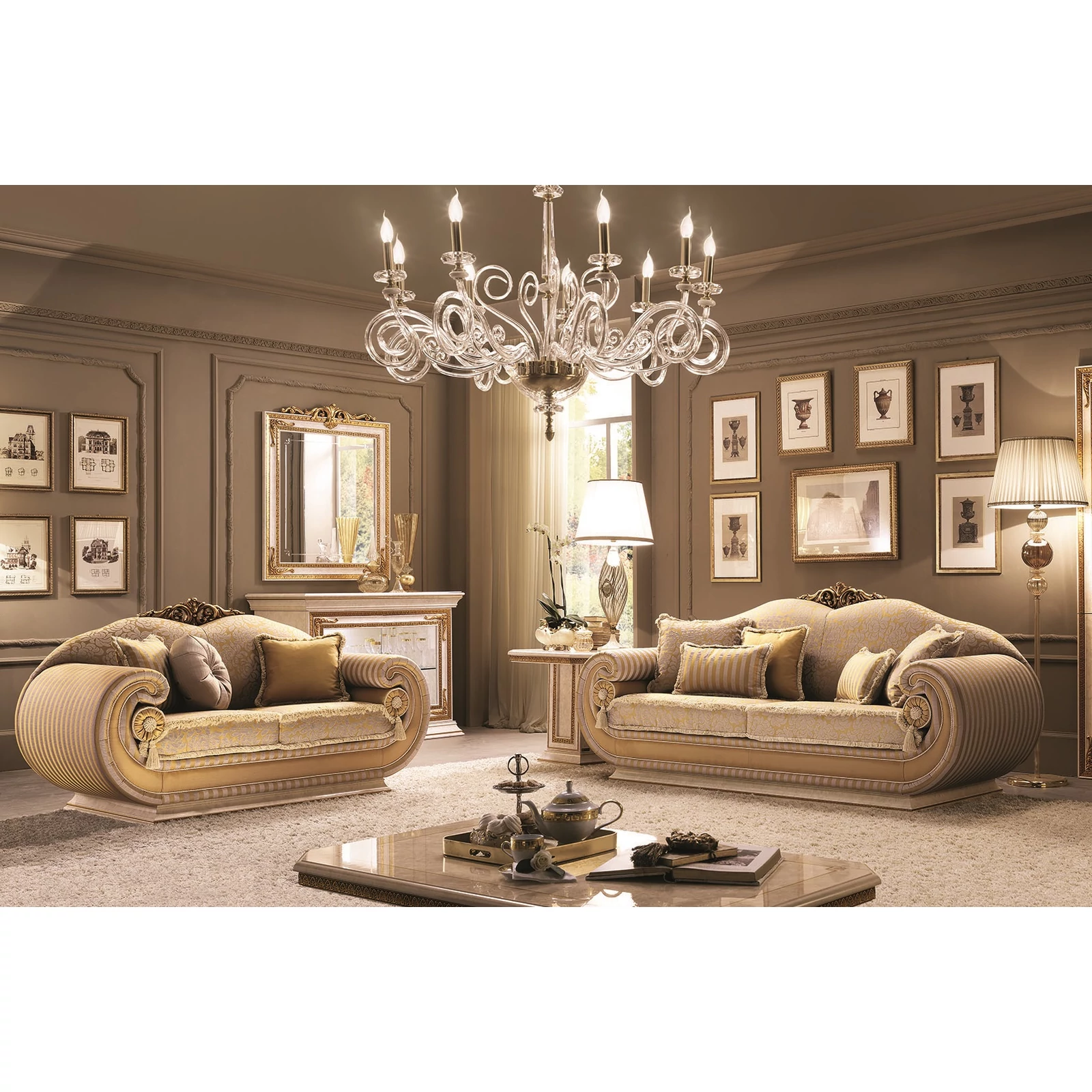 A Leonardo olasz étkező és nappali garnitúra minden elemén megfigyelhetjük, ahogy a szobába áramló fény megcsillan a gyönyörűen díszített, aranyszínű felületeken. A márvány csillogását tükröző nagy felületeket csak ezek a mesteri díszítések törik meg. Az ArredoClassic gyár kiváló mesterei olyan remekművet alkottak, melynek luxus hangulatát együtt élvezheti családjával és barátaival. Vitrinjei, tükrei akár egy extra aranyszínű, antikolt díszkoronával is kiegészíthetők - válogassa össze ponsotan azt a garnitúrát, amelyre Önnek van szüksége és rendezze be vele szobáit!