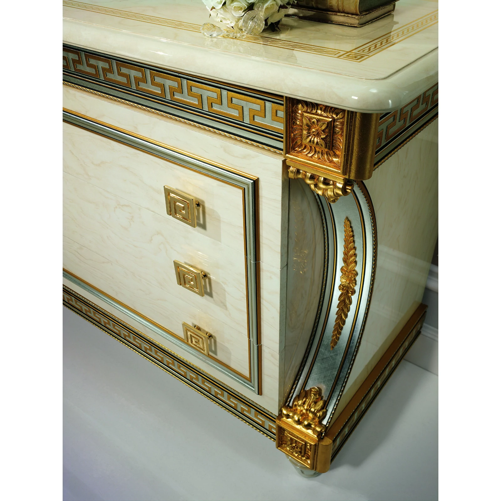 Az ArredoClassic Liberty fantázianevű kollekciója fényt, világosságot és eleganciát hoz otthonába, folyamatosan ámulatba ejtve mind használóit, mind a vendégeket. Gyönyörű krémszínű márványfelületeit csodálatra méltó összhanggal egészítik ki az ezüst részletek, melyeket az aranyszínű virágminták tesznek még különlegesebbé. Otthonát olyan luxushelyszínné varázsolja a modellsorozat minden darabja, melyben minden eltöltött perc gyönyörködtet. Válogassa össze azt a szettet, amely igazán Önhöz illik, és egy műremekkel lesz gazdagabb! A Liberty családban található hálószoba, nappali, étkező és ülőbútor is, tekintse meg mindet!