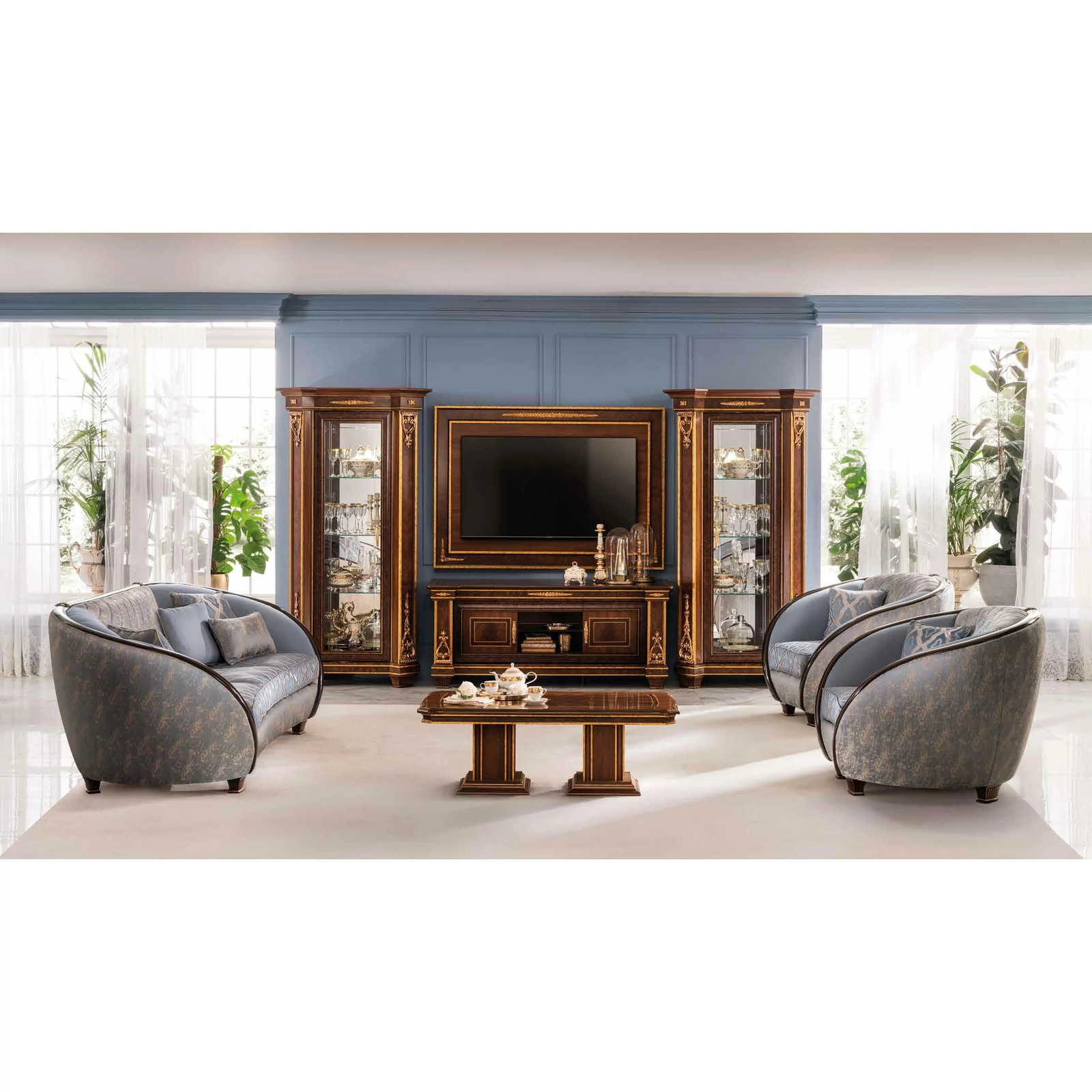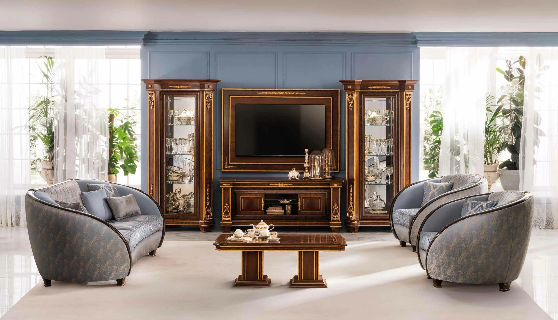 A becses intarziákkal díszített tálalókomód és a felette látható, metszetekkel ékesített fenséges tükör megjelenése valóban látványos. A vitrin pompás oldalsó pilléreit tollmintázatú mahagóni betétek díszítik, tetejüket és alsó részüket pedig kézzel készített aranyfüstlemez dekorációk ékesítik. A fotelek és kanapék harmonizáló formája, valamint a fali bútorelemek, mint a függő TV fali panel egyszerű vonalvezetése tökéletesen kiegészítik egymást. Vendégszerető, maximálisan kifinomult és egyben praktikus: a háromszemélyes kanapé pompás vendégággyá is alakítható a látogatók számára. A Modigliani kollekció a dolgozószobában található fiókos szekrénnyel is rendelkező íróasztallal egészül ki, melyhez egy elegáns, bőrborítású irodai fotel dukál. Az aranyozott oldalsó pillérek és az aranyfüstlemezzel díszített korona motívumai harmonikusan összekötik a kollekció minden egyes elemét. Értékes szövetek, minden részletében alapos kidolgozás és kiváló minőségű anyagok a jellegzetes olasz ízlést jelképezik.