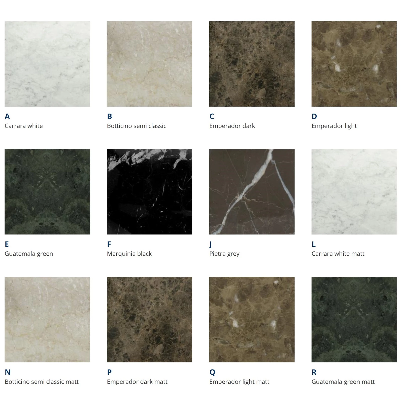 Választható márványlapok: Carrara white, Botticino semi classic, Emperador dark, Emperador light, Guatemala green, Marquinia black, Pietra grey, Carrara white matt, Botticino semi classic matt, Emperador dark matt, Emperador light matt, Guatemala green matt, Marquinia black matt