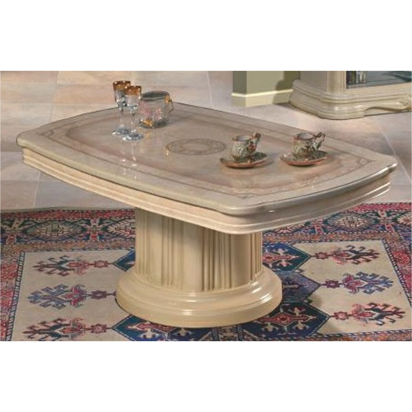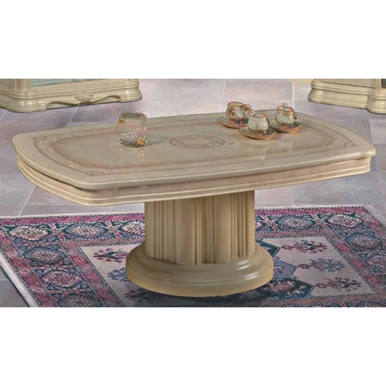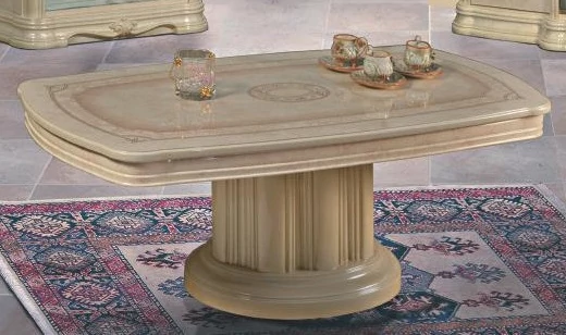 Az asztalt két hatalmas láb támasztja alá, amelyek egy kagylóra emlékeztetnek. A szekrény és a komód azonos szerkezetű, középen fiókkal és három zárható ajtóval, a tükör pedig hatalmas. Ilyen egy valódi olasz nappali.