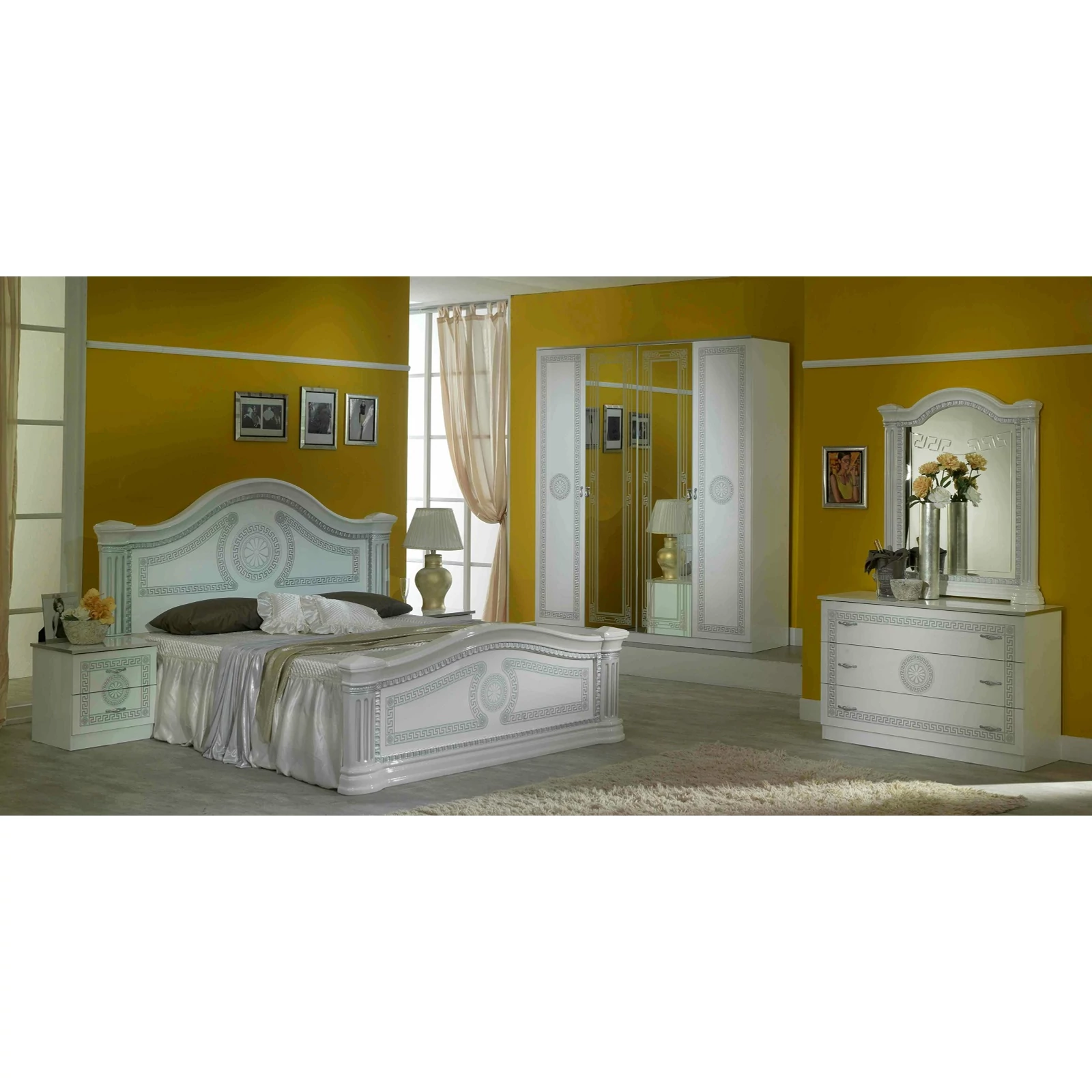 BC Serena hálószoba - fehér-ezüst, 160x200 cm ággyal, 4-ajtós szekrénnyel