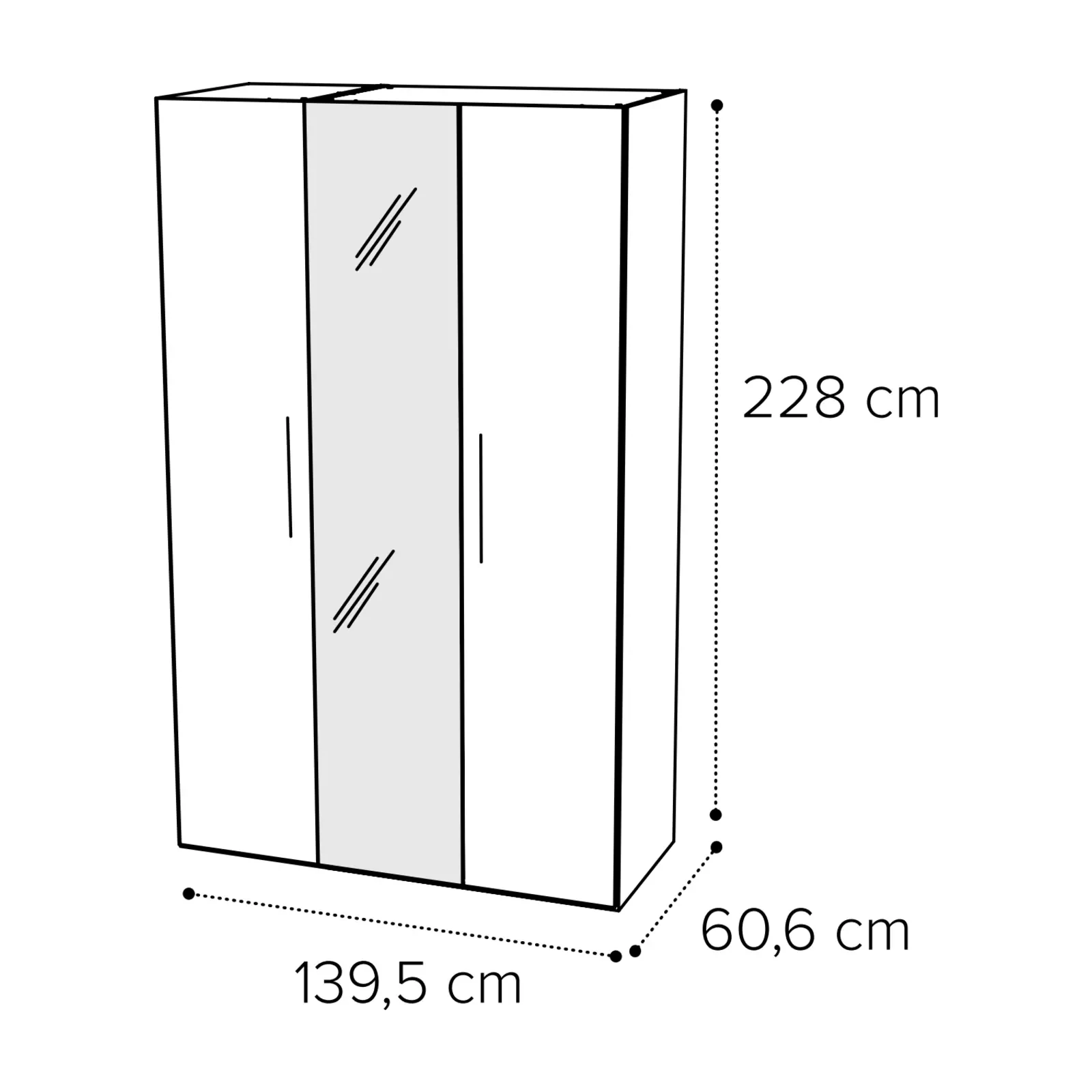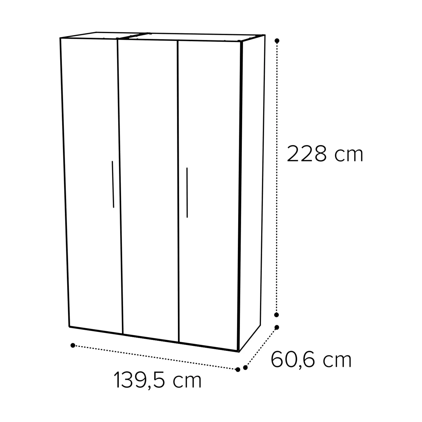 - 3 ajtós változat: 139,5×60,6×228 cm