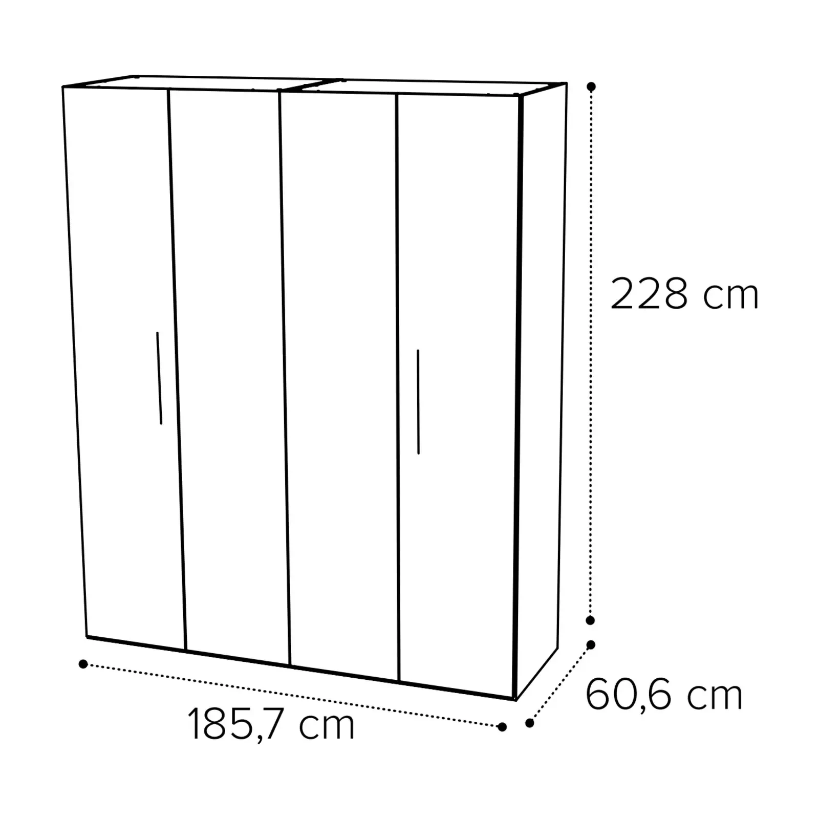 - 4 ajtós változat: 185,7×60,6×228 cm