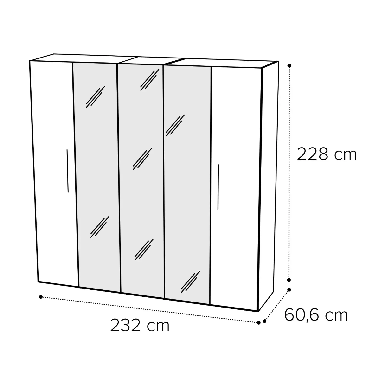- 5 ajtós változat: 232×60,6×228 cm