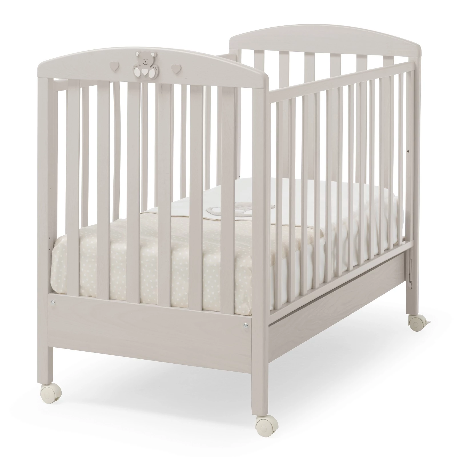 AZ ÁGY BEÁLLÍTÁSA: Az ágy mindkét oldala leengedhető, ami a bababiztos síneknek köszönhetően megkönnyíti a mozgást a rács alsó helyzetben való rögzítése során. A sínek megfelelnek az európai biztonsági előírásoknak, és segítségükkel két egyszerű mozdulattal beállíthatók: kézzel emelje fel a rácsot, majd nyomja meg a rács alsó részét a lábával. Az oldalrács felemeléséhez fordított sorrendben járjon el: először nyomja meg lábával a rács alsó részét, majd emelje fel kézzel. Javasoljuk, hogy a két oldal valamelyikét rögzítse, így a kiságy stabilabban áll majd.