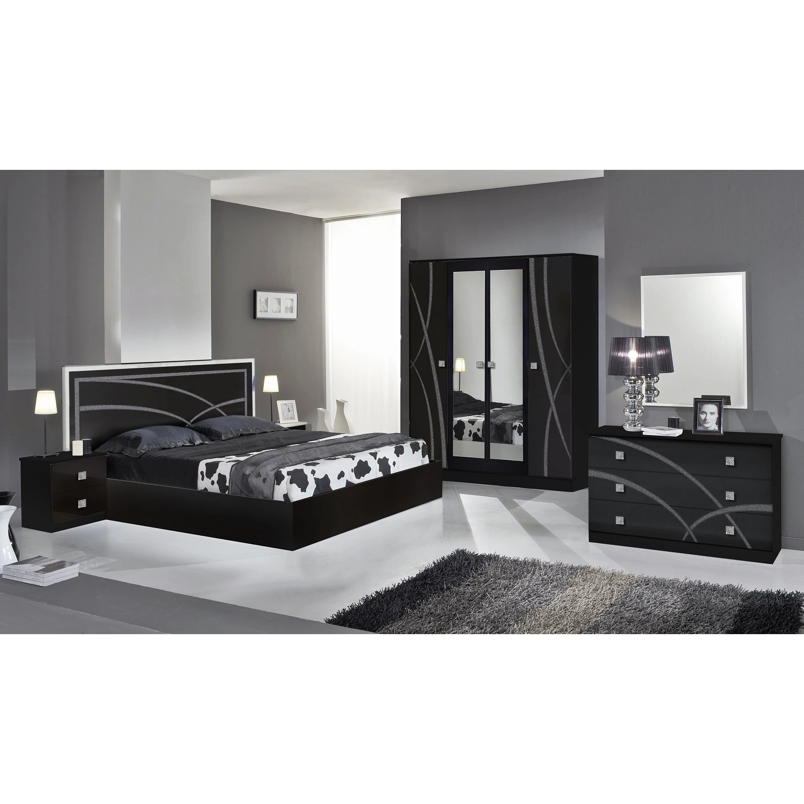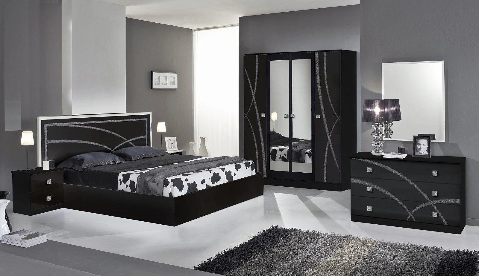 DI Ambra hálószoba - fekete, 180x200 cm ággyal, 4-ajtós szekrénnyel