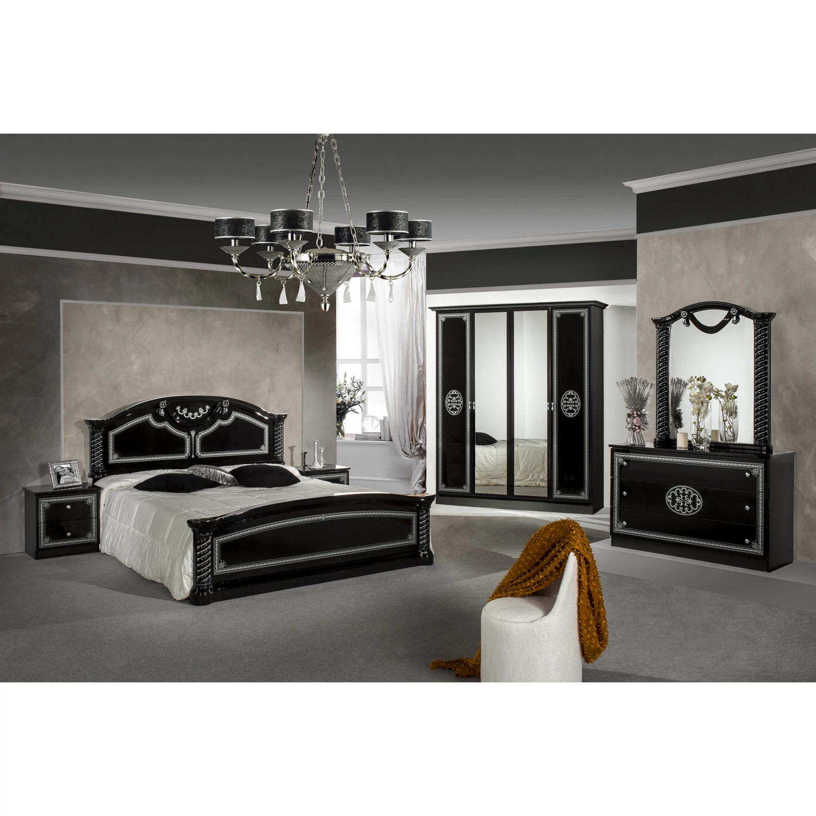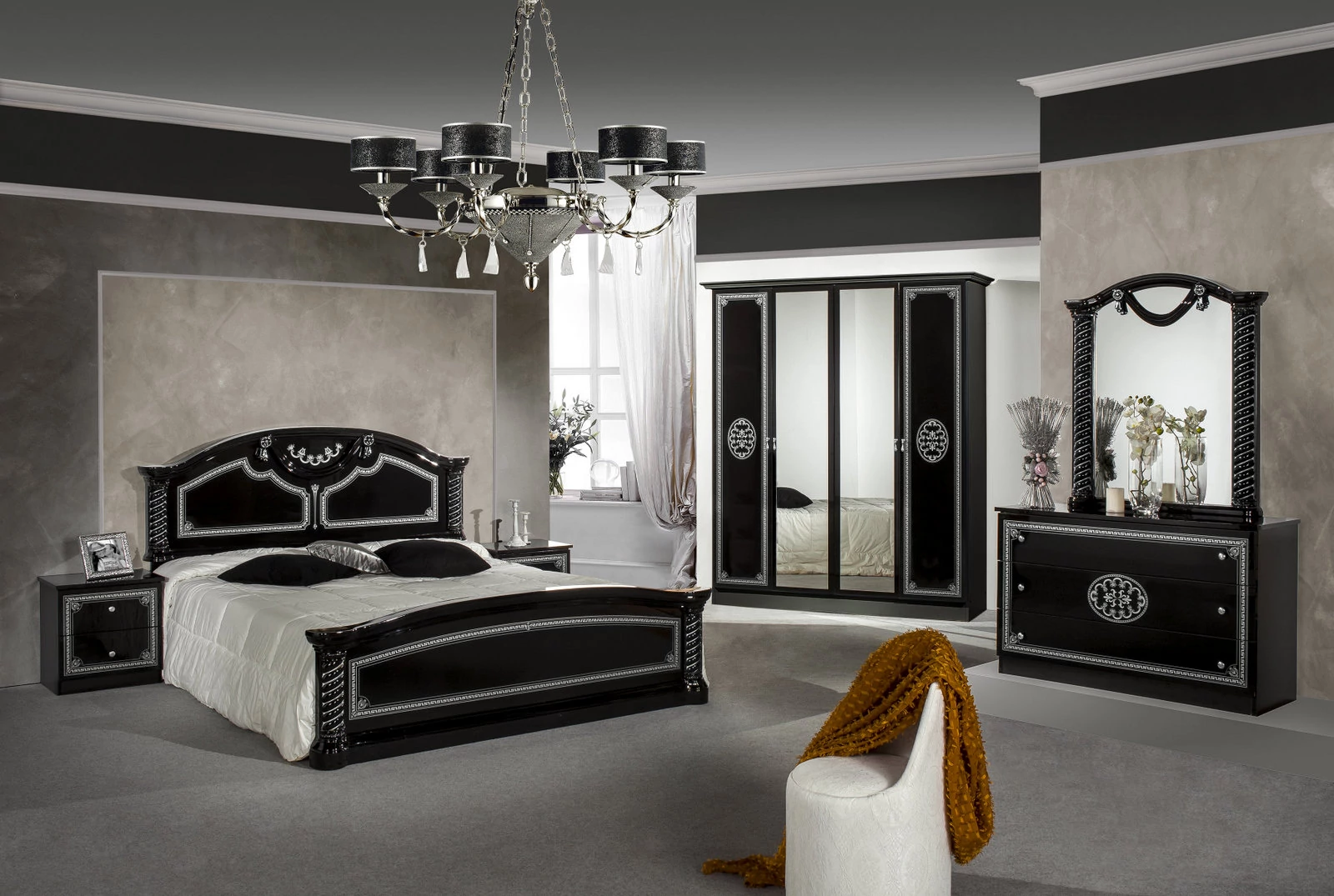 DI Vera hálószoba - fekete-ezüst, 160x200 cm ággyal, 4-ajtós szekrénnyel