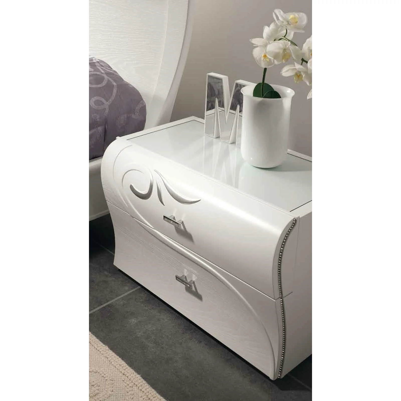 A komód és éjjeliszekrények szerkezete festett farészecskés panelekből áll fehér lakkozással, a fiókok előlapja faszerű anyagból, nyílt pórusú kőrisfaszínű és festett, lakkozott fehér részletekkel. A komód és éjjeliszekrény oldalai 30 mm vastagságúak. Minden fiók lengéscsillapítós sínekkel, blumotion típusú fékezőrendszerrel van felszerelve. A bútordarabok teteje 4 mm vastag, fehérrel díszített vagy festett üvegkristályból készült.