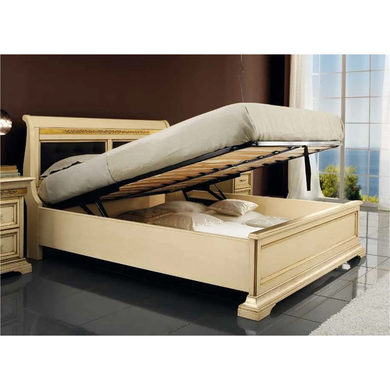 - Edera intarziás franciaágy keret ágyneműtartóval: 1800mm x 2080mm x 1140mm