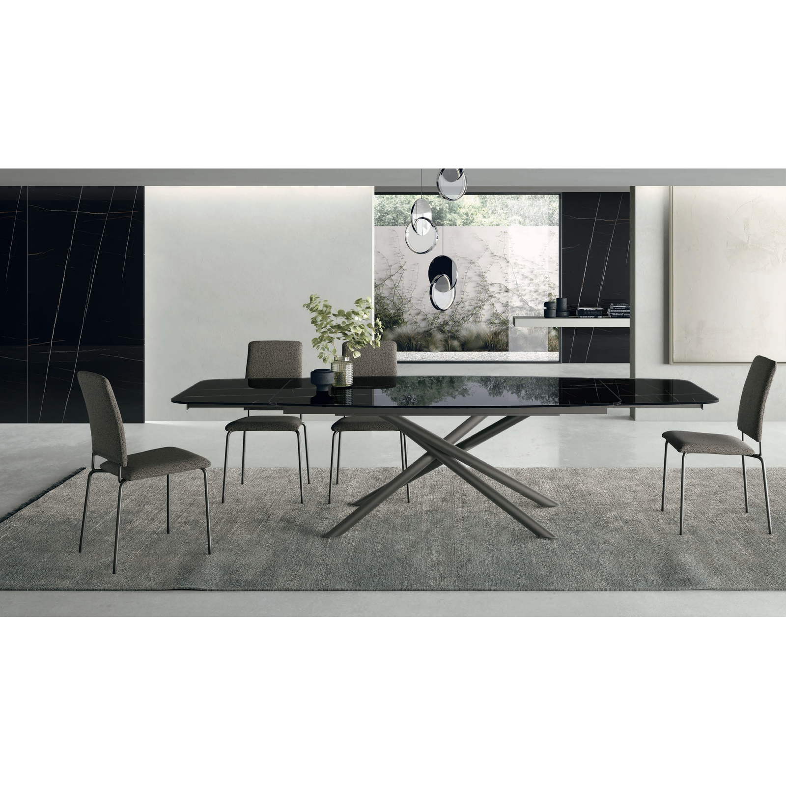 A Glamour étkezőasztal eleganciáját a karakteres, festett fém talp és a kifinomult felületek adják. Ez a bővíthető asztal a Crono System mechanizmust tartalmazza, az asztallap pedig téglalap alakú vagy íves kivitelben, illetve strukturált matt, kerámia vagy nyomtatott üveg változatban érhető el.