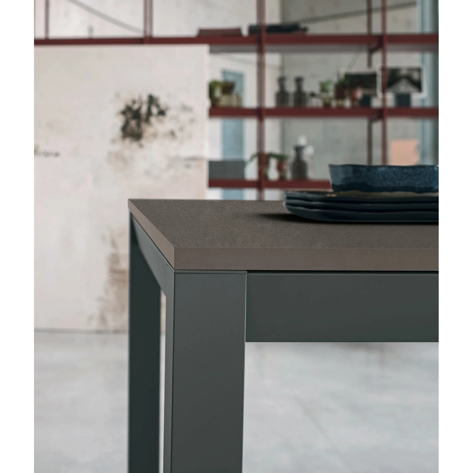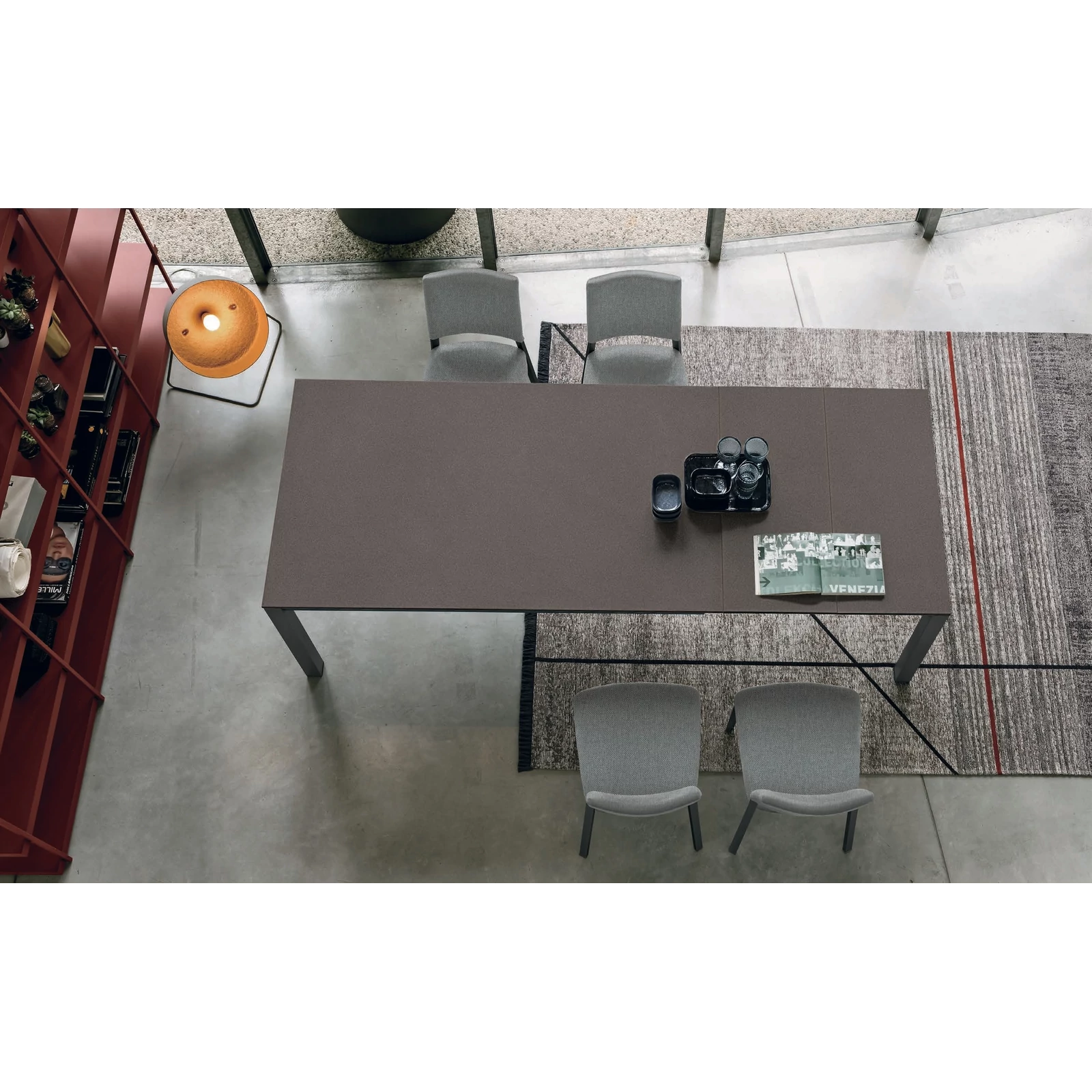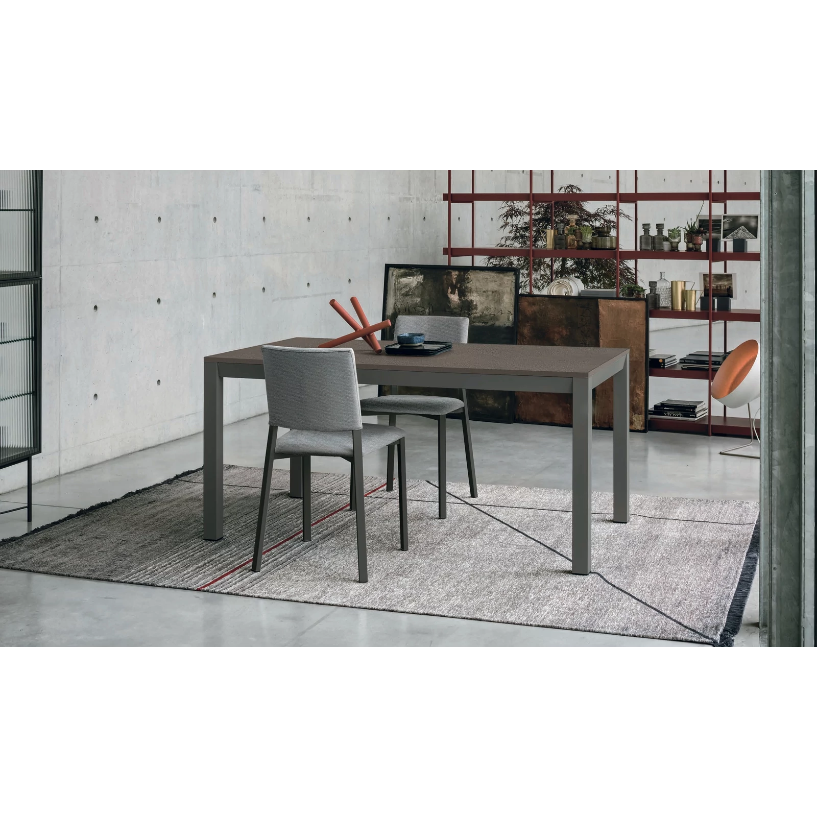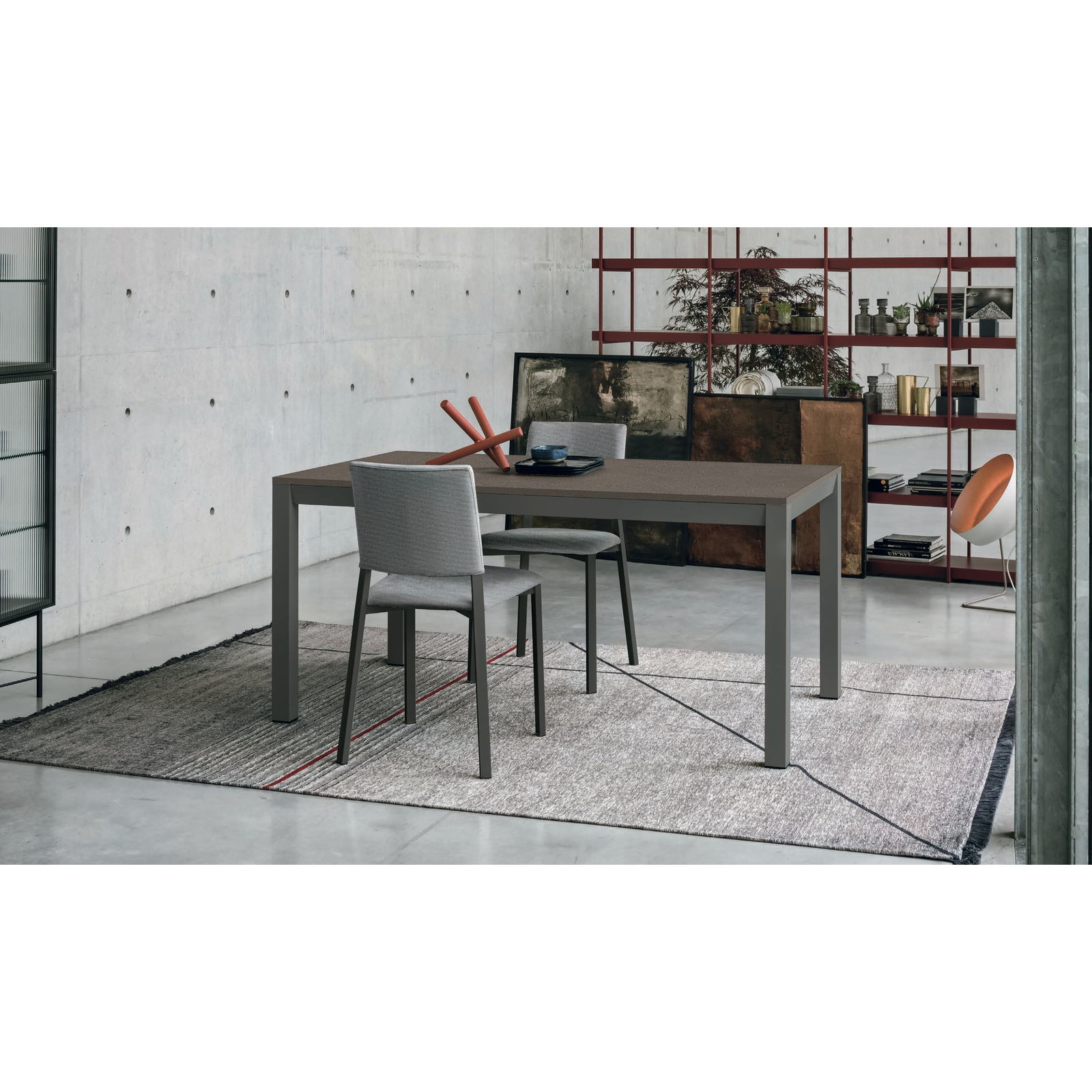 A Space étkezőasztal különleges alumínium szerkezete centiméterre pontosan testreszabható. Ez a bővíthető asztal festett fém lábakkal, téglalap vagy négyzet alakú asztallappal készül, felülete pedig a Cross System mechanizmusnak köszönhetően gyorsan, egyszerűen megnövelhető. Az asztallap strukturált matt vagy kerámia kivitelben rendelhető.