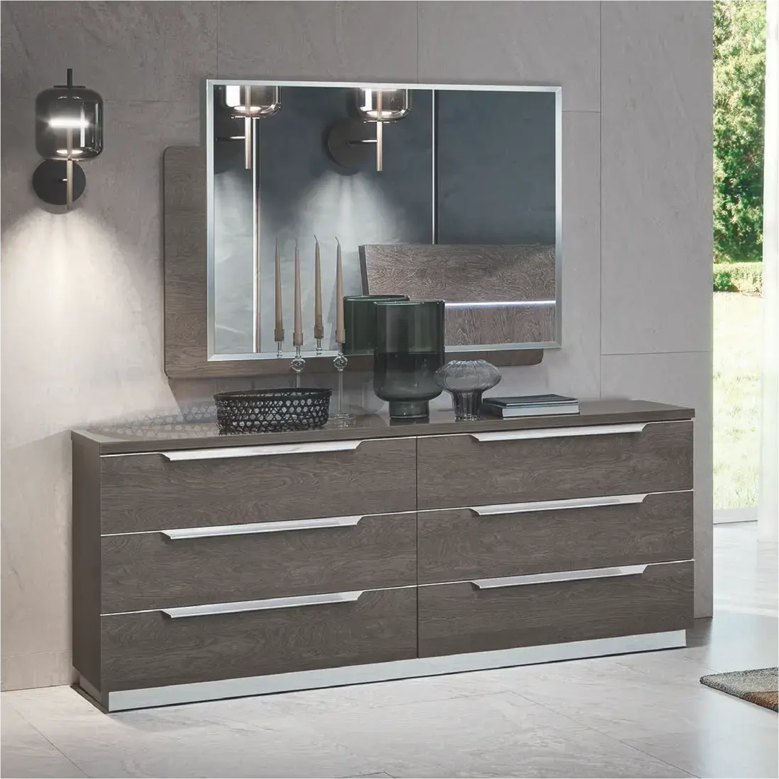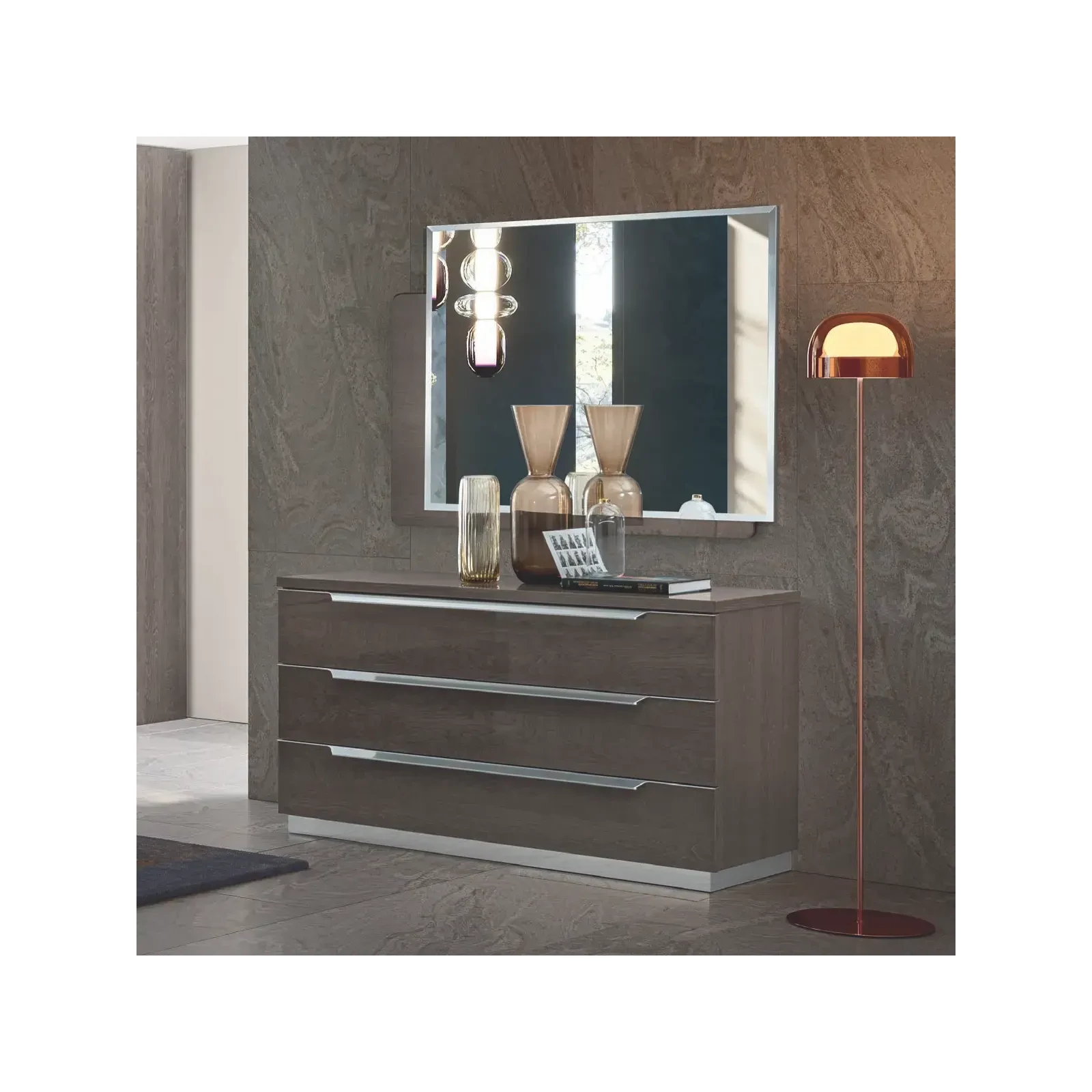 Az olasz Kroma hálószobakollekciót a CamelGroup szakemberei tervezték, exkluzív színeivel modern eleganciát kölcsönöz bármelyik hálószobának. Trapéz alakú, szálcsiszolt alumínium fogantyúi látványos kontrasztot teremtenek a kollekció kétféle színben – velencei szürke vagy ezüst nyír – választható felületeivel. A fejvég egyszerű, mégis kifinomult megjelenését a vízszintes és függőleges mintázatok, valamint a különböző vastagságok játékának köszönheti, melyet egy állítható LED fénycsík tesz igazán különlegessé. A moduláris gardróbszekrények széles választéka bármely igényt kielégít, a különböző opcionális kiegészítőkkel pedig személyre is szabhatja az élményt. Az éjjeliszekrények és komódok 30 mm vastag fedlapokkal és finom élekkel készülnek, a karcmentes belső felületek pedig időtálló minőséget garantálnak.