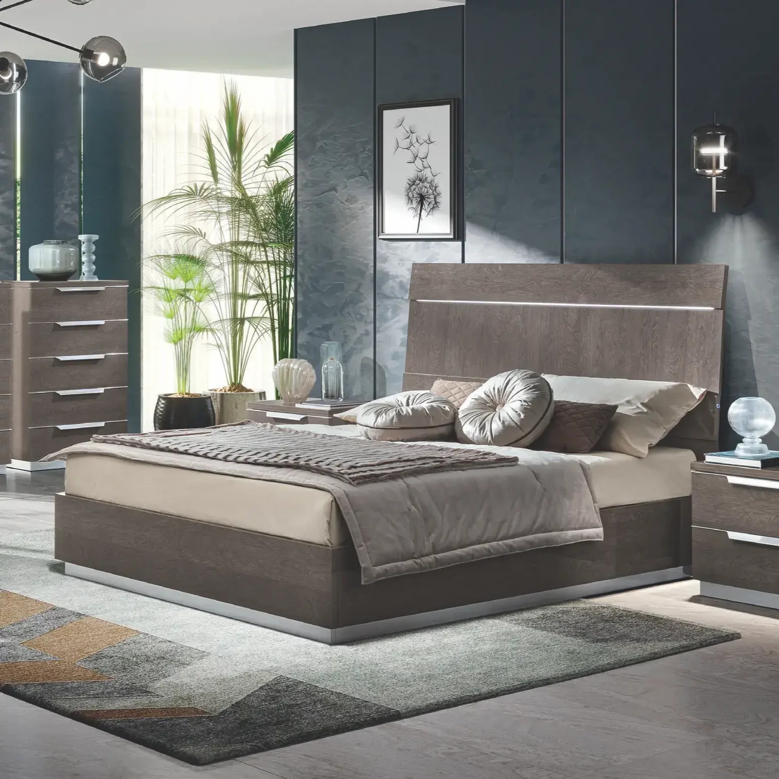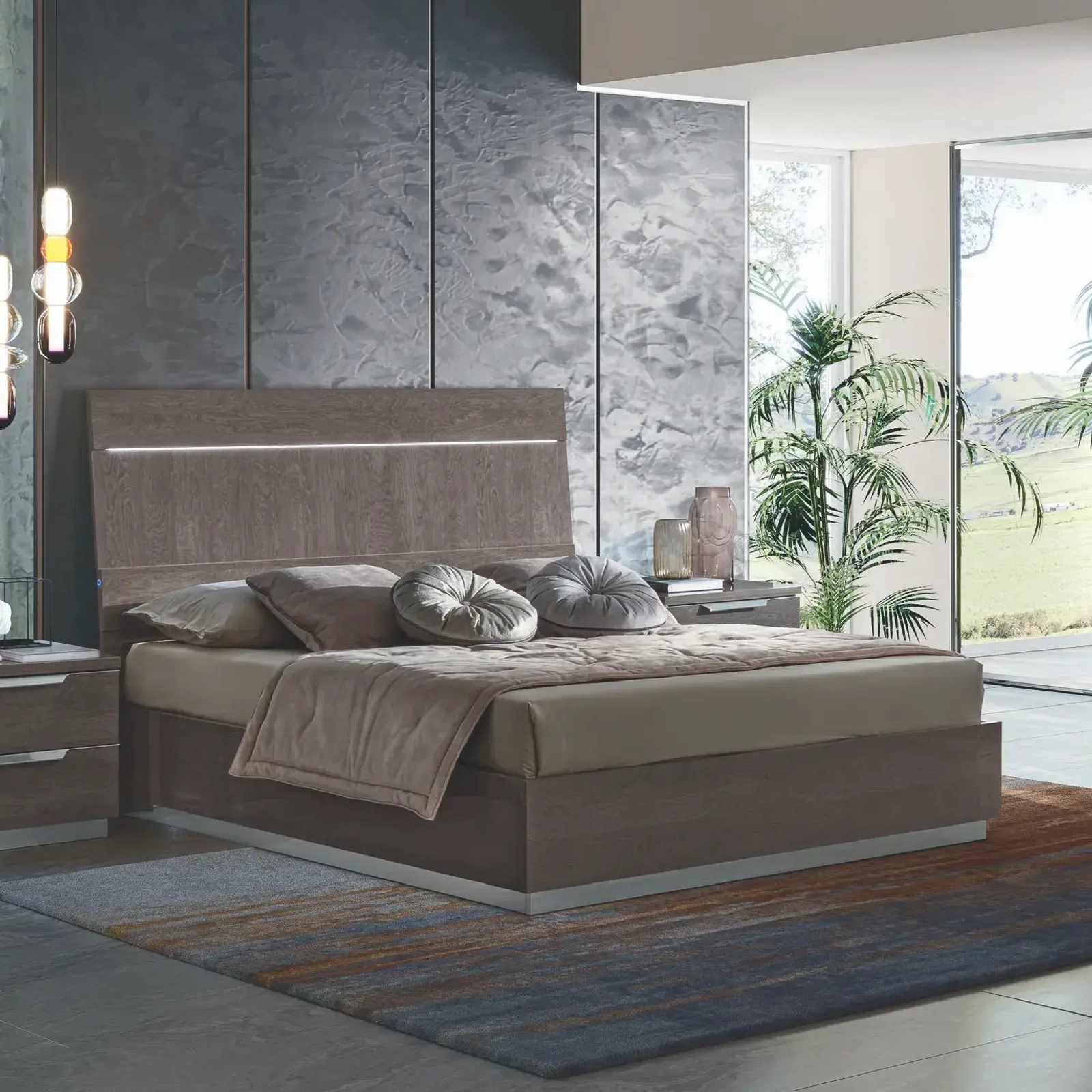 Az olasz Kroma hálószobakollekciót a CamelGroup szakemberei tervezték, exkluzív színeivel modern eleganciát kölcsönöz bármelyik hálószobának. Trapéz alakú, szálcsiszolt alumínium fogantyúi látványos kontrasztot teremtenek a kollekció kétféle színben – velencei szürke vagy ezüst nyír – választható felületeivel. A fejvég egyszerű, mégis kifinomult megjelenését a vízszintes és függőleges mintázatok, valamint a különböző vastagságok játékának köszönheti, melyet egy állítható LED fénycsík tesz igazán különlegessé. A moduláris gardróbszekrények széles választéka bármely igényt kielégít, a különböző opcionális kiegészítőkkel pedig személyre is szabhatja az élményt. Az éjjeliszekrények és komódok 30 mm vastag fedlapokkal és finom élekkel készülnek, a karcmentes belső felületek pedig időtálló minőséget garantálnak.
