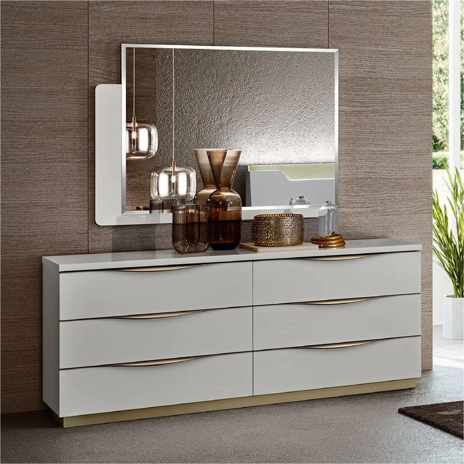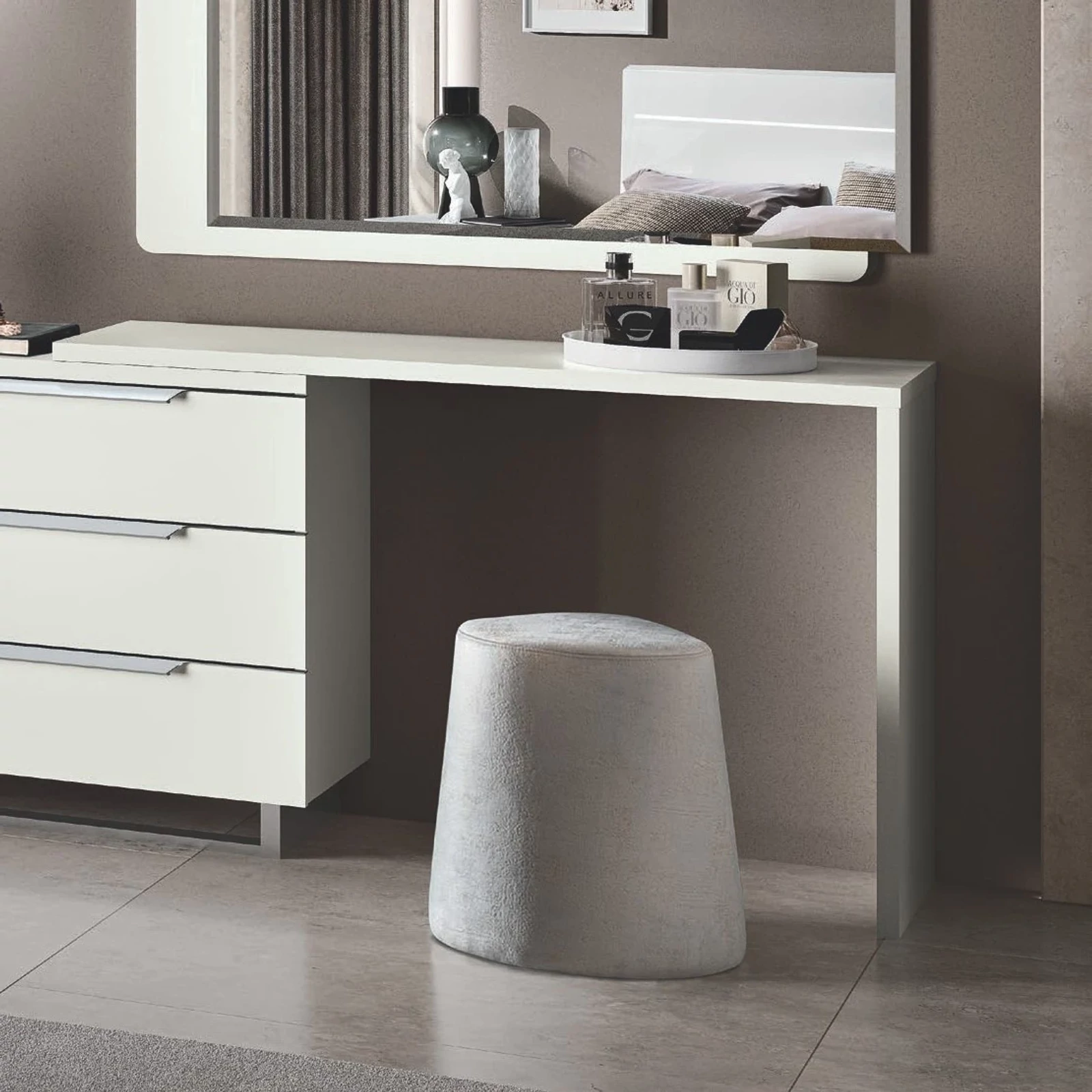 A Kharma fésülködőasztal-keret, melyet úgy terveztek, hogy könnyen kombinálható legyen a kollekció fiókos komódjaival, elegáns luxus megjelenéssel és praktikus megoldásokkal egészíti ki hálószobáját.