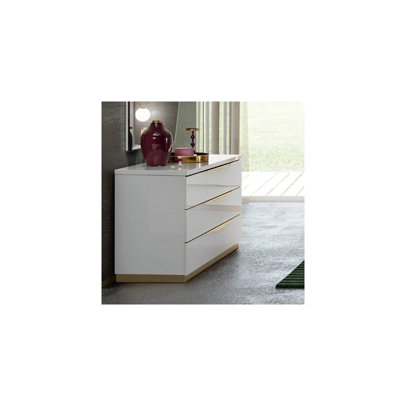 A Kharma hálószobakollekció az olasz dizájnt és a luxus minőséget ötvözi. Ragyogó fehér, fényes felülettel, hajlított alumínium fogantyúkkal és pezsgőszínű ecsetelt szegélyekkel minden eleme a modern kifinomultságot testesíti meg. Időtálló, funkcionális kialakításáról a moduláris gardróbszekrények, a sima élű, vastag fedlapok és a karcálló, lassan záródó fiókok gondoskodnak. Vigyen fényt hálószobájába a hátulról megvilágított velencei üveg fejvéggel, mely aranyporral ecsetelt üvegen keresztül szórja a fényt.