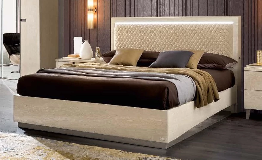 Ambra franciaágy keret, kárpitozott fejvéggel, LED világítással, bézs színű műbőrrel, 180x200 cm - nyírfa
