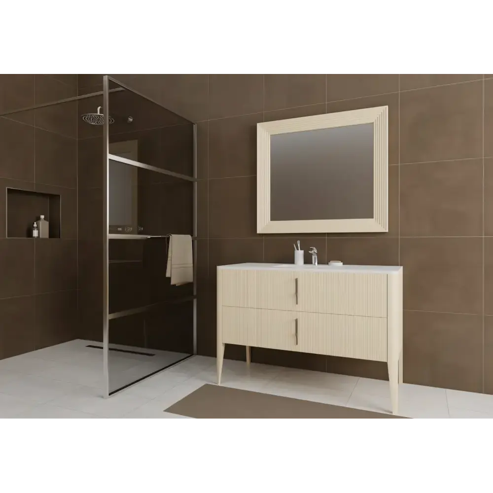 - 1 db fürdőszobaszekrény 2 fiókkal, bordázott dizájnnal, fehér carrara márvánnyal, finoman záródó fiókokkal, mosdókagylóval (MR-4657): 120×59×82 cm