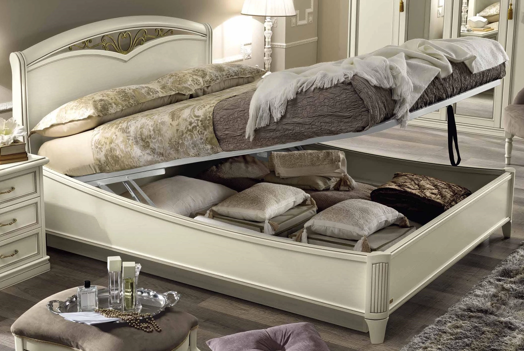 Giotto franciaágy keret ágyneműtartóval, hajlított oldallal, íves fejvégű fémbetétes díszráccsal, alacsony lábvéggel, 180x200 cm - antik fehér