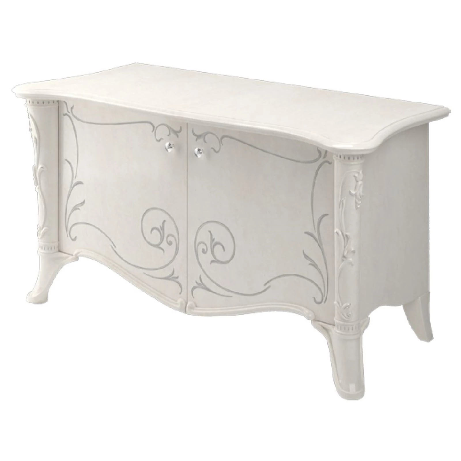 Az alap színárnyalat egyenletesen lép át a világosból a fehér színbe. A szekrényajtókat élénk alakzatok és természetes hatású vonalak díszítik, a szekrény középső részét és az asztallábakat pedig faragások gazdagítják.