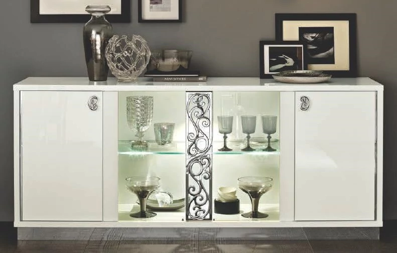 4-ajtós tálalókomód üvegpolc: 3 x 120 mm-es rozsdamentes acél profil LED-lámpával (1,8 W alacsony fogyasztás - 3000 Kelvin, meleg fényű).