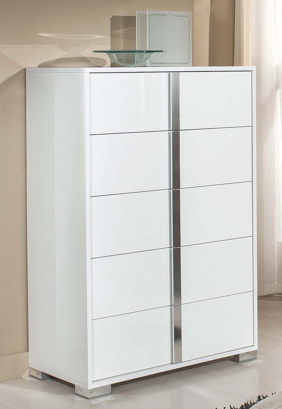 Az ágy öko-bőrrel bevont fejvégét egy krómozott keret koronázza meg, melyből hasonló krómfelületet a többi bútordarabon is megtalálhatjuk, de az igazi ragyogást a körbefutó LED-fények adják neki, így ez az elem garantáltan a szoba középpontjává válik majd. A szépséget és funkcionalitást ötvöző garnitúra tökéletességét a magasfényű felületek emelik ki igazán.