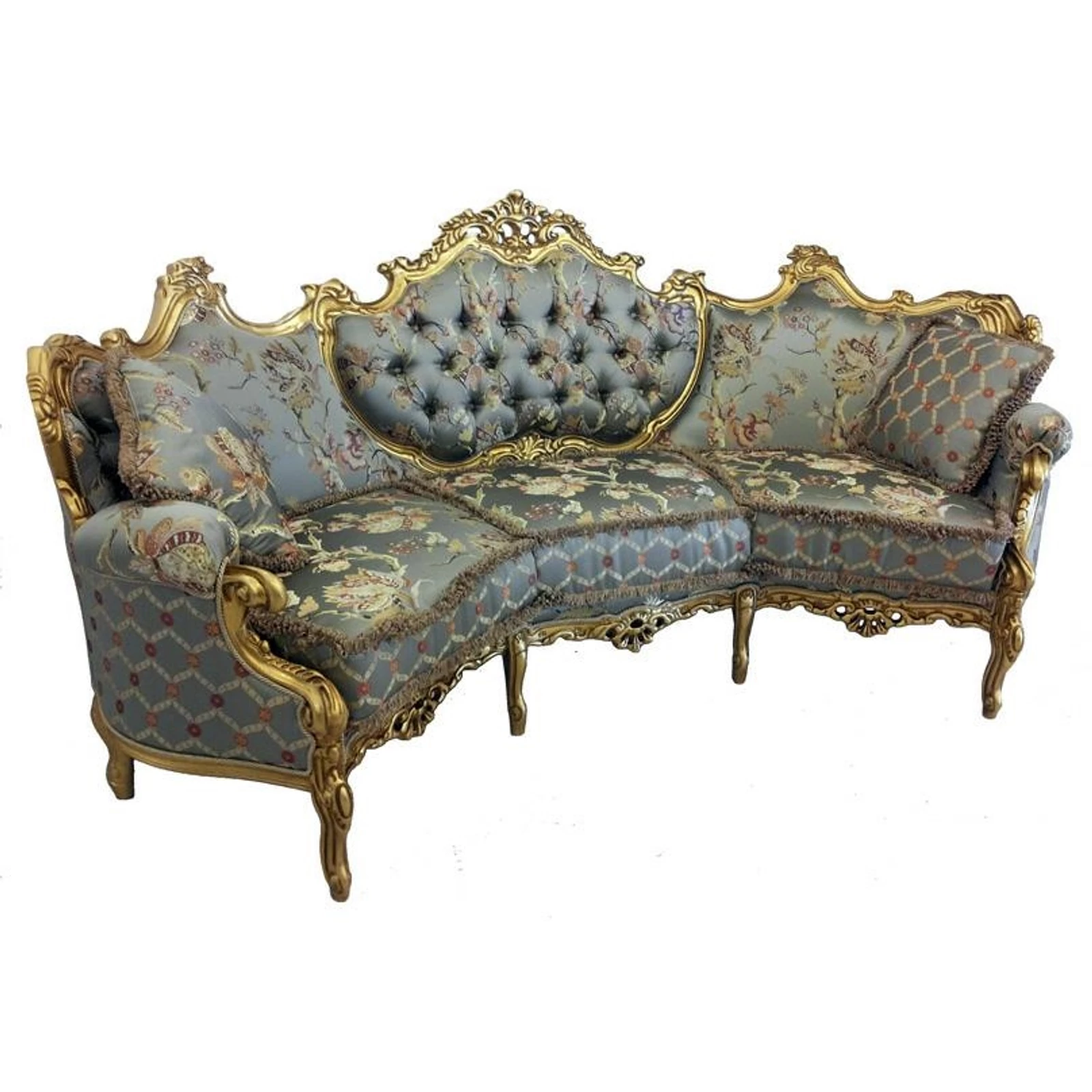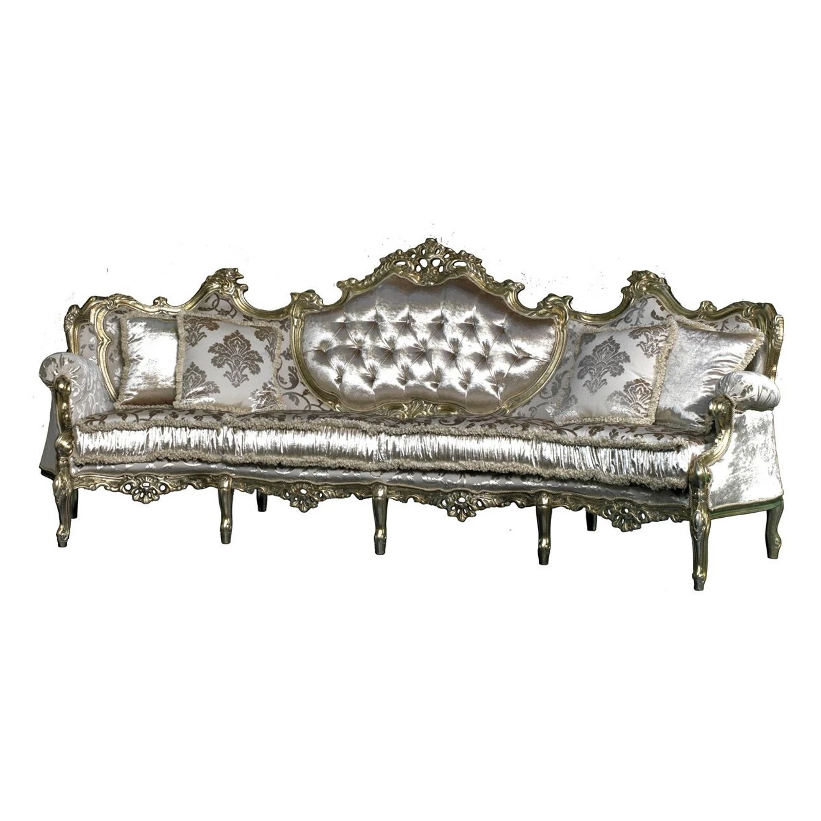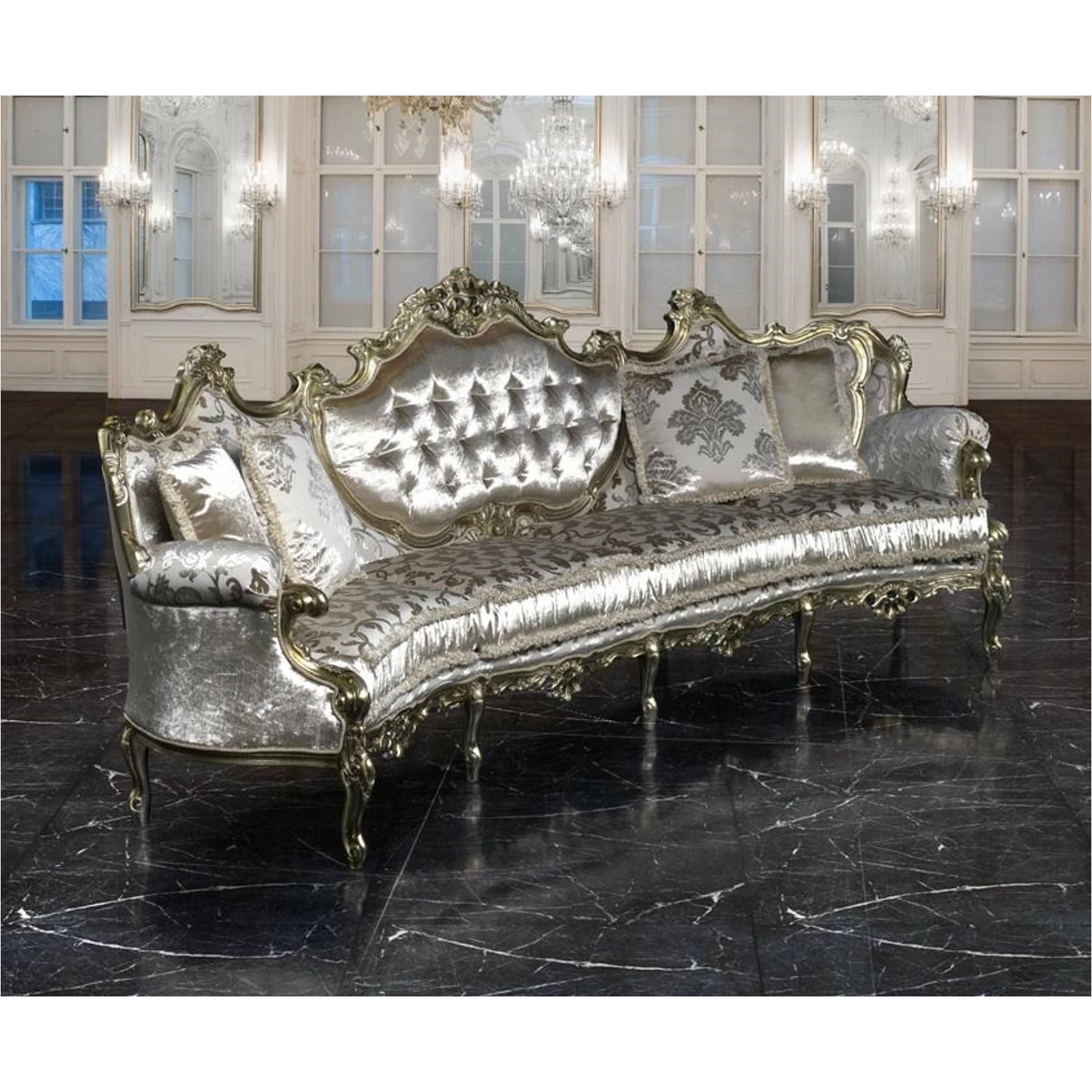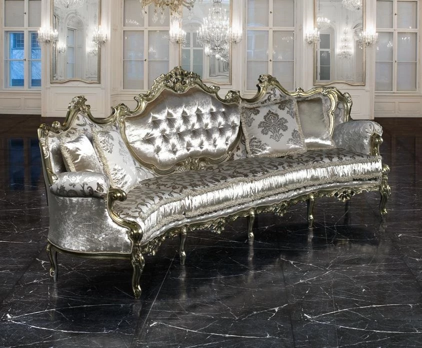 Egy barokk stílusú dívány, magasztos vonalvezetéssel, mely nagyszerűséget, gazdagságot és kifinomultságot sugároz.