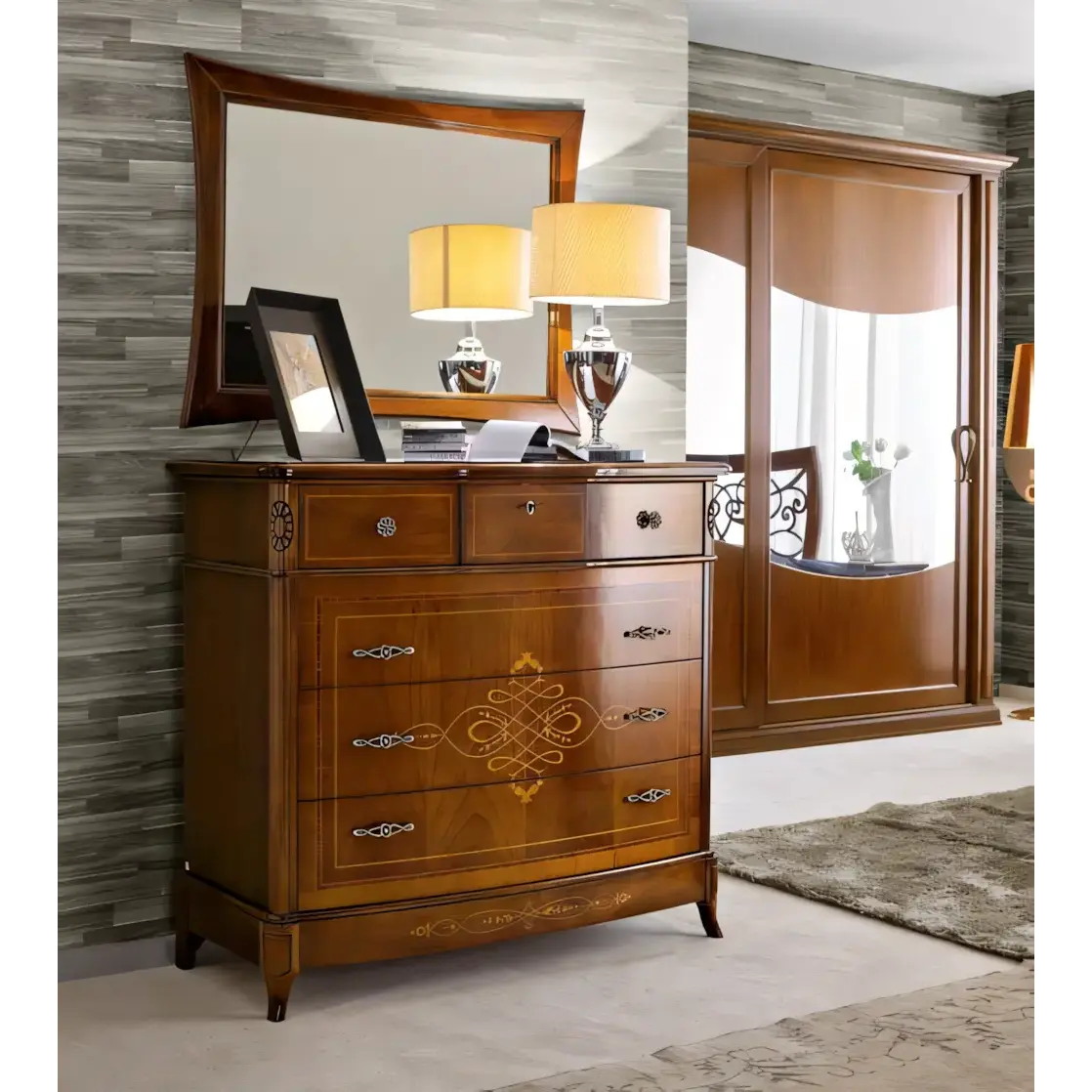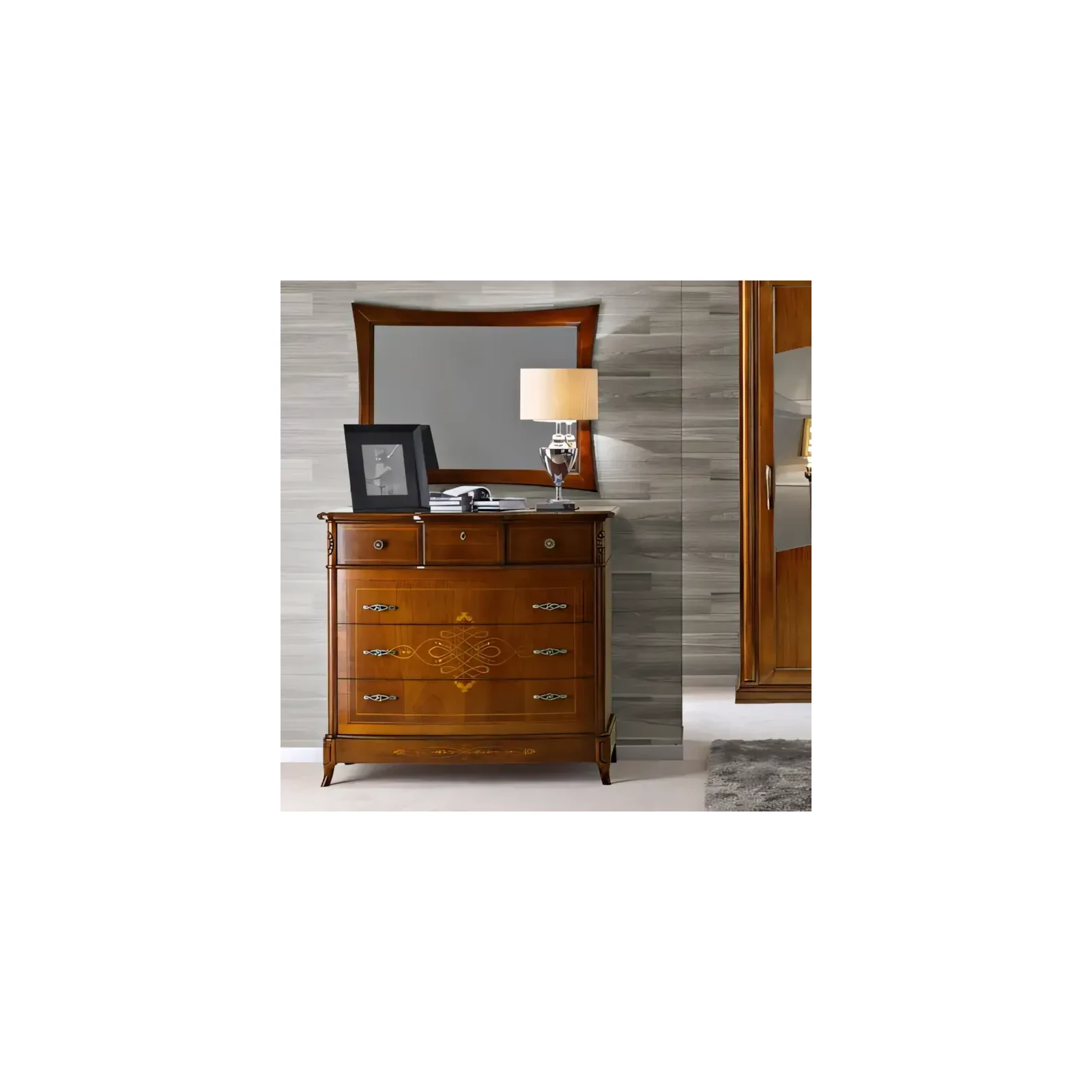 Ezt a komódot elegáns formák és gazdag díszítések teszik a hálószoba egyik legszebb darabjává. A klasszikus stílus időtálló szépsége és a prémium minőségű anyaghasználat a Morello olasz dizájnjának legjavát tükrözi.