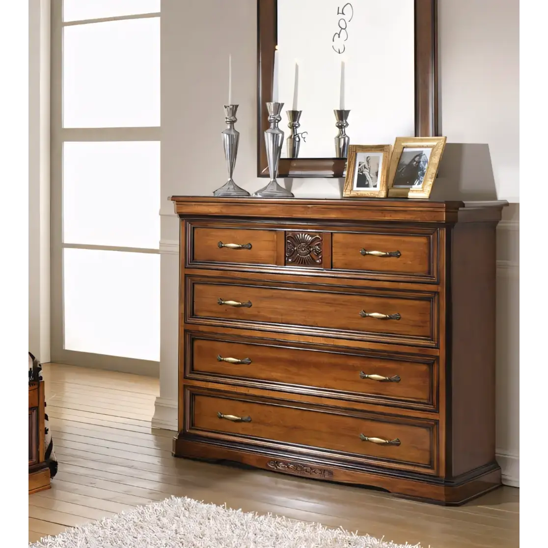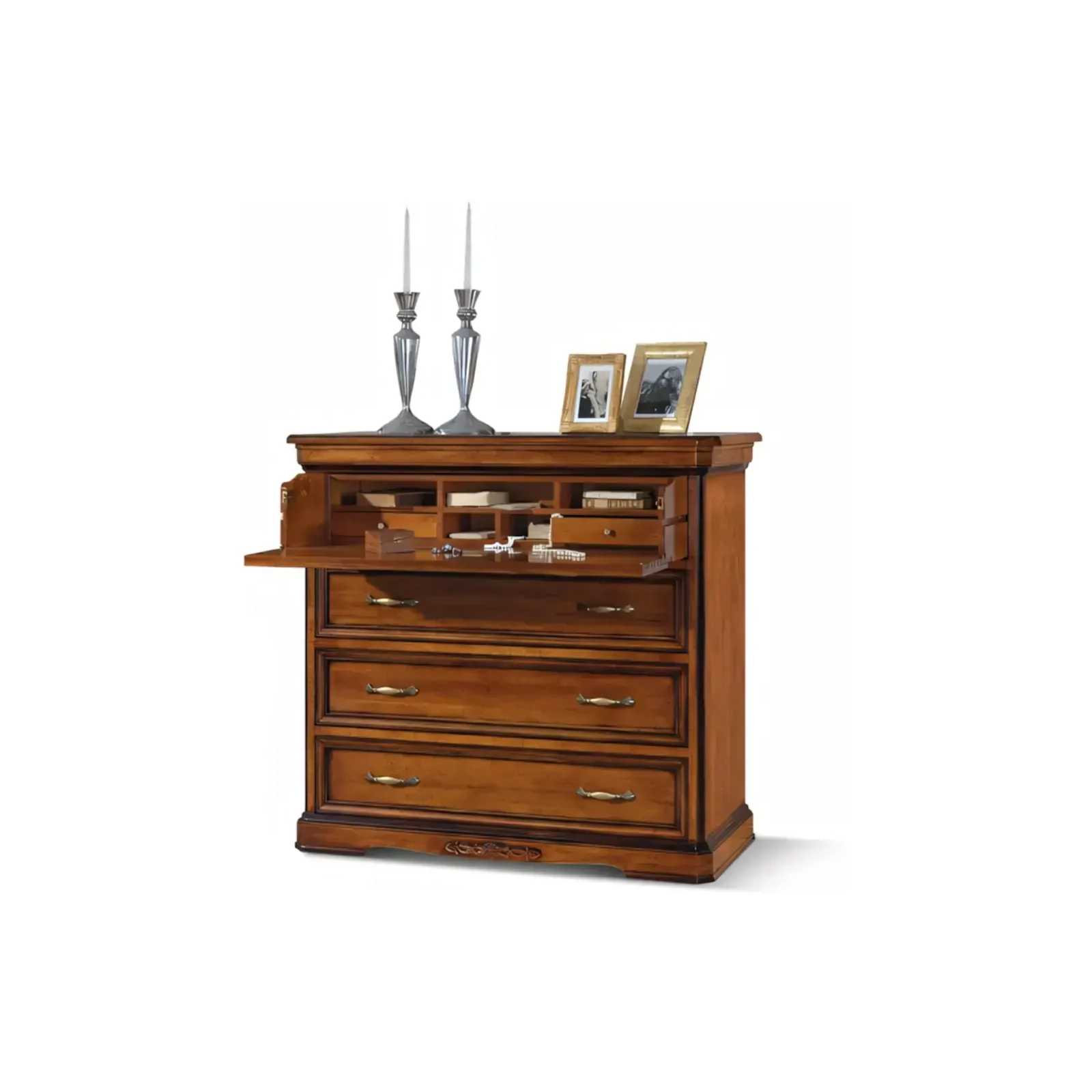 Morello rusztikus stílusú komód 4 fiókkal, lehajtható ajtó nélkül, intarziás