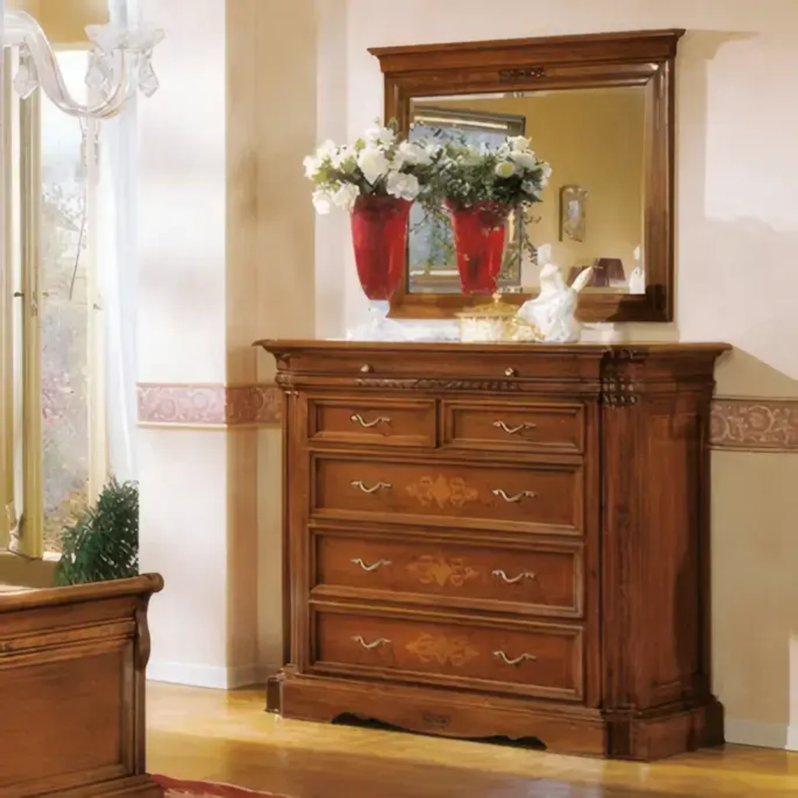 Ezt a komódot elegáns formák és gazdag díszítések teszik a hálószoba egyik legszebb darabjává. A klasszikus stílus időtálló szépsége és a prémium minőségű anyaghasználat a Morello olasz dizájnjának legjavát tükrözi.