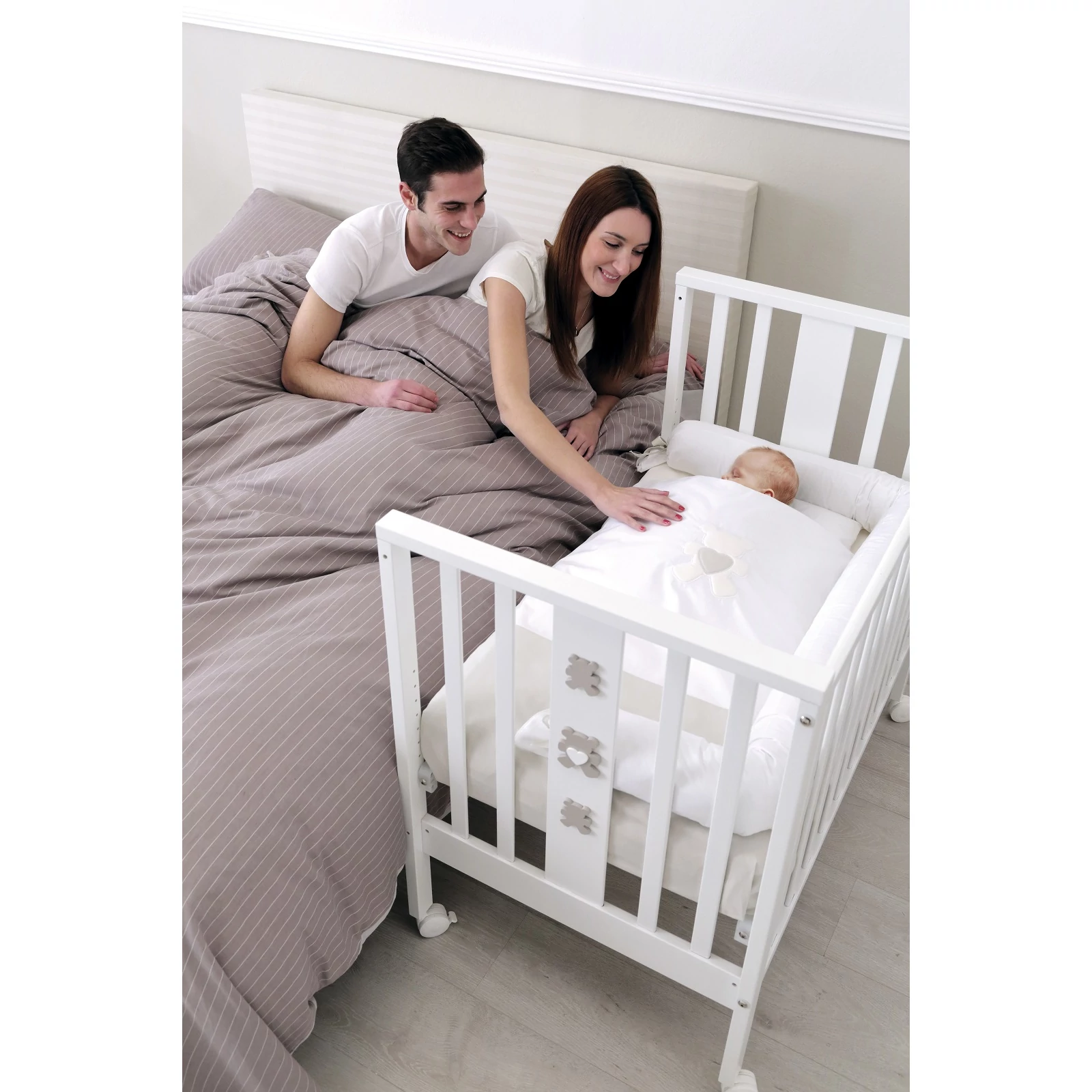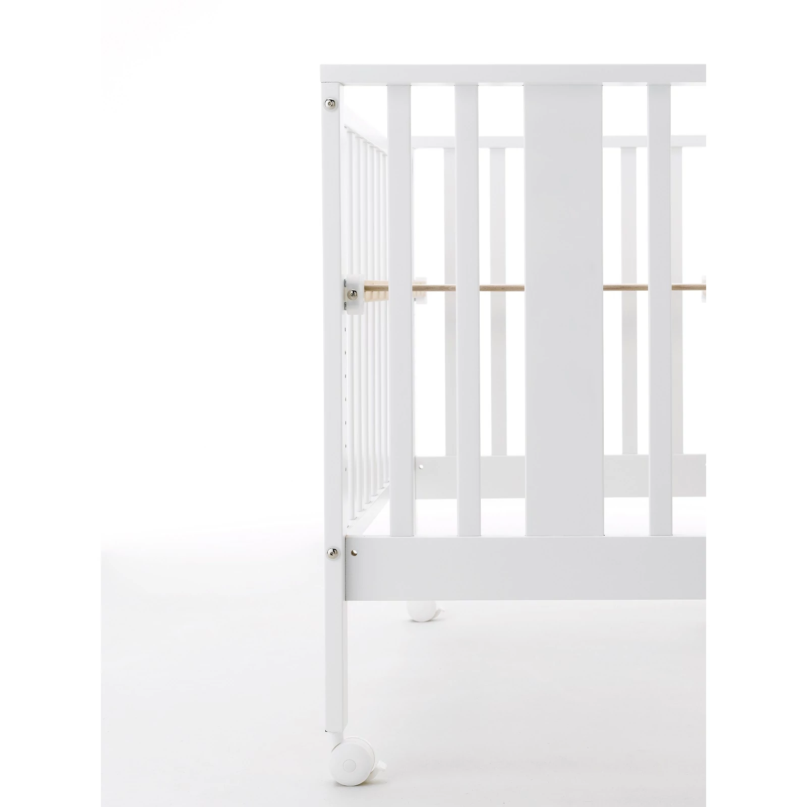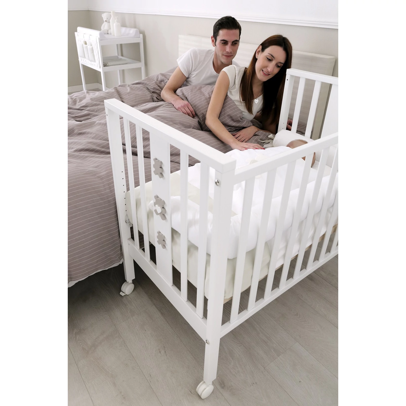 Ha kicsavarjuk a kiságy 4 darab csavarját és leengedjük az oldalsó rácsot, a biztonsági hevedereknek és a két darab, fékkel ellátott keréknek köszönhetően a kiságyat könnyedén az ágyhoz rögzíthetjük, így a kisgyermek együtt alhat szüleivel.