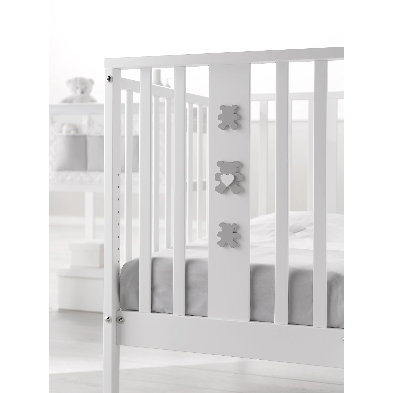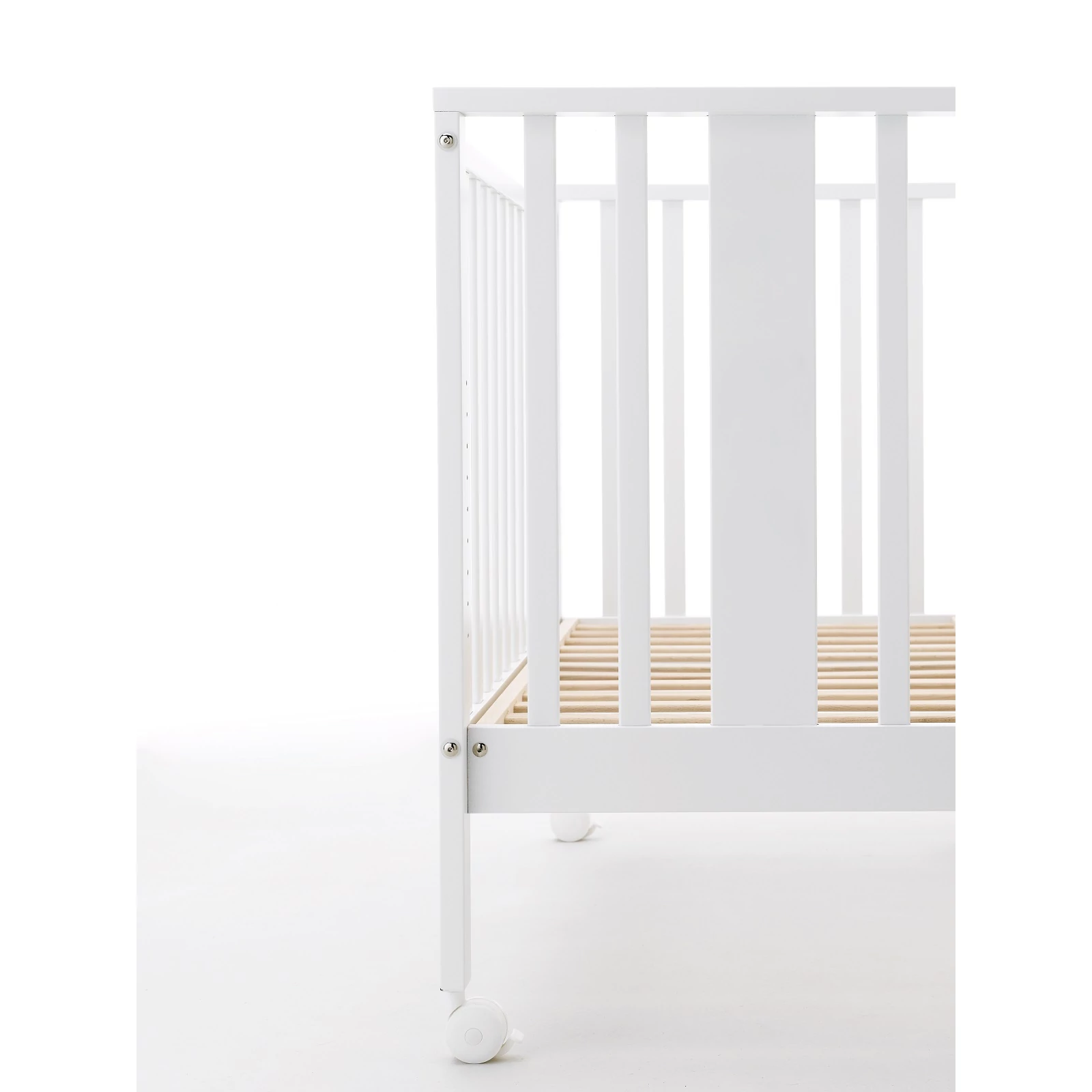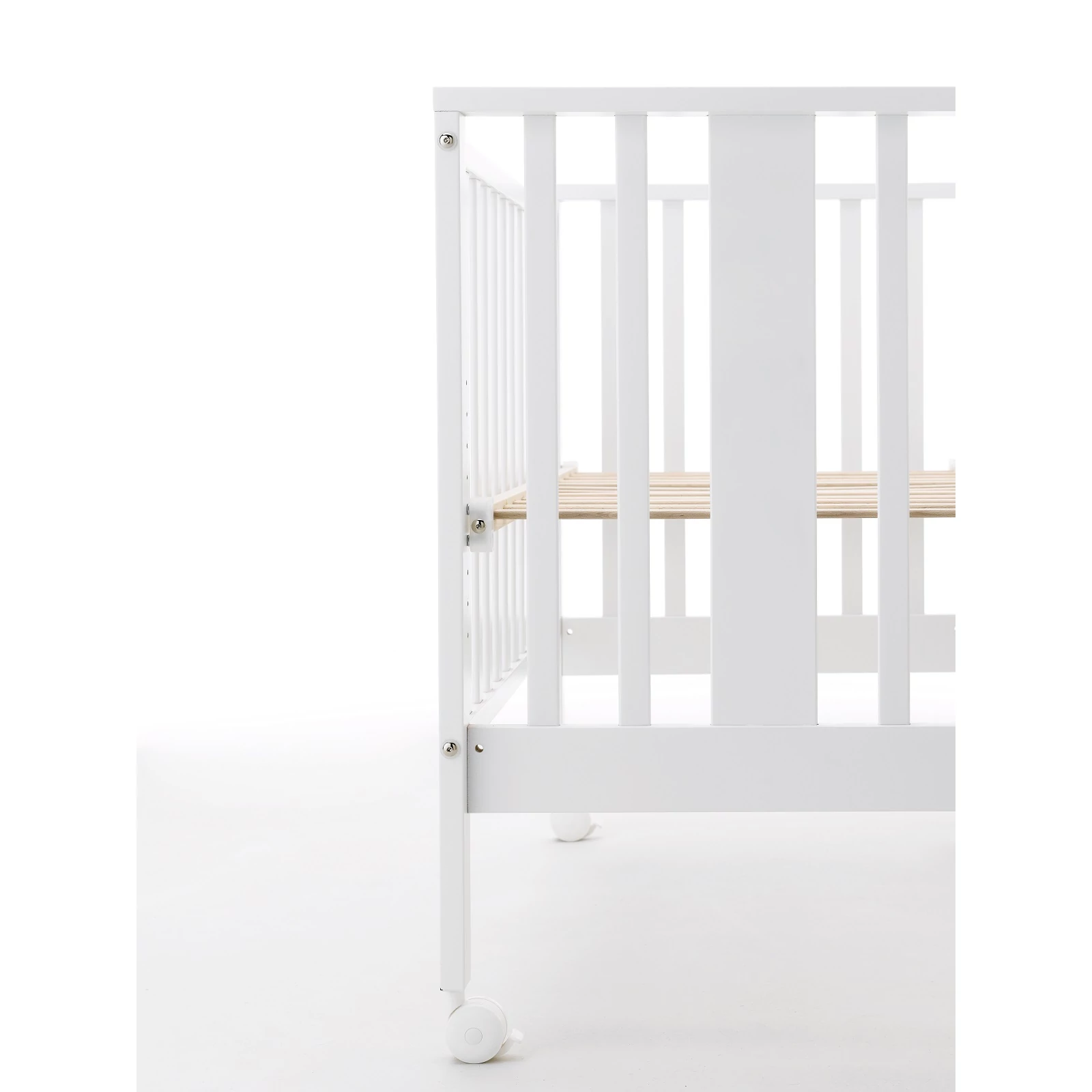 Ha kicsavarjuk a kiságy 4 darab csavarját és leengedjük az oldalsó rácsot, a biztonsági hevedereknek és a két darab, fékkel ellátott keréknek köszönhetően a kiságyat könnyedén az ágyhoz rögzíthetjük, így a kisgyermek együtt alhat szüleivel.