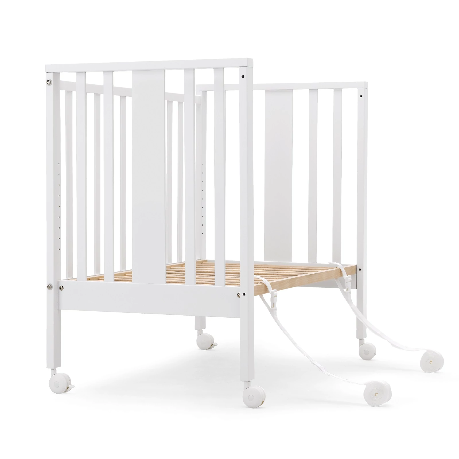 A tömör bükkfából készült Mini kiságy kiváló választás az együtt alváshoz, hiszen a 4 darab, bármilyen irányba forgó kerekének, melyek közül kettő fékkel is rendelkezik, valamint a 2 biztonsági hevedernek köszönhetően könnyedén a felnőttágyhoz igazítható és rögzíthető.