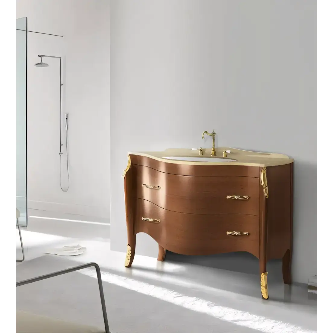 Morello klasszikus stílusú fürdőszobaszekrény 2 fiókkal, íves dizájnnal, sahara gold márvány fedlappal, finoman záródó fiókokkal, mosdókagylóval