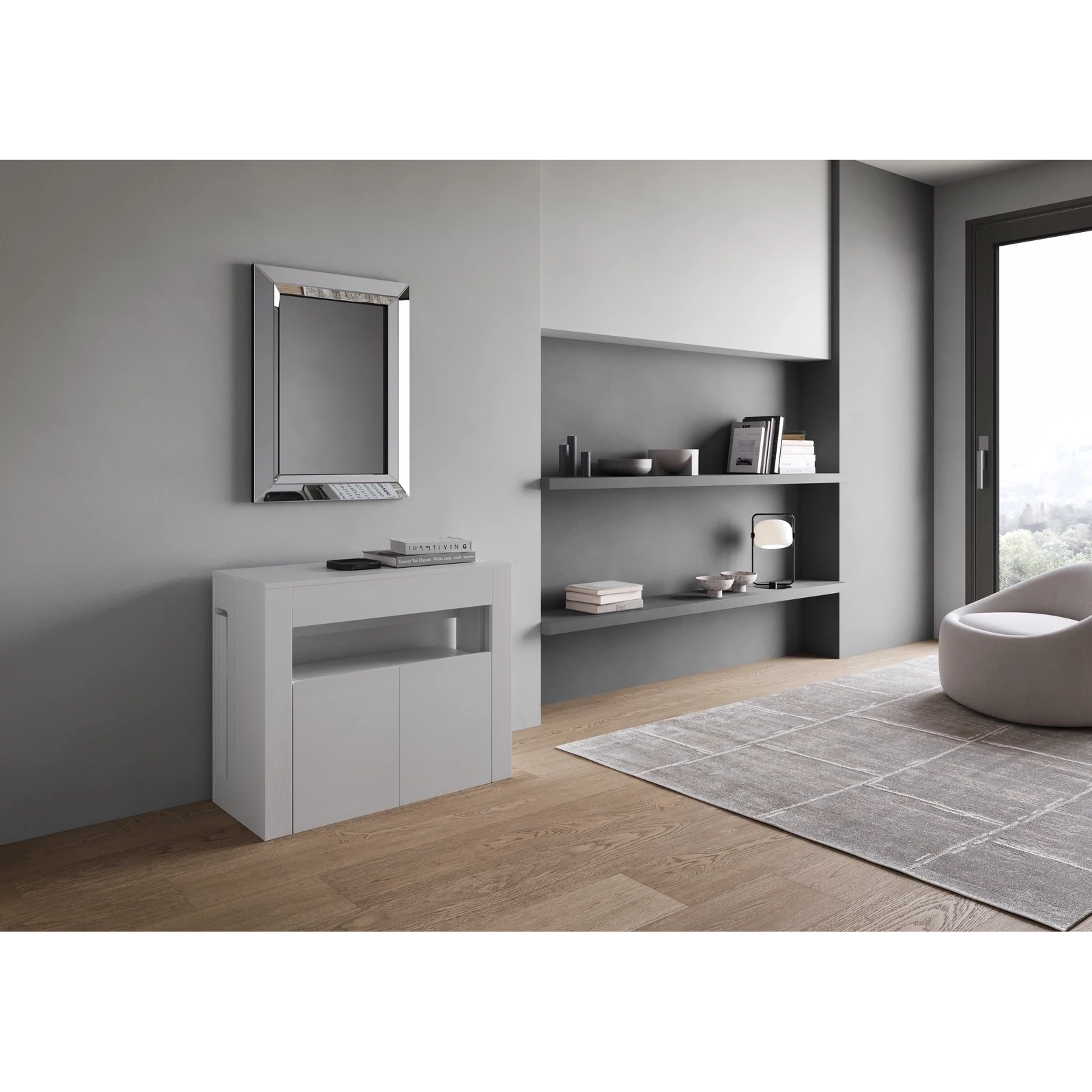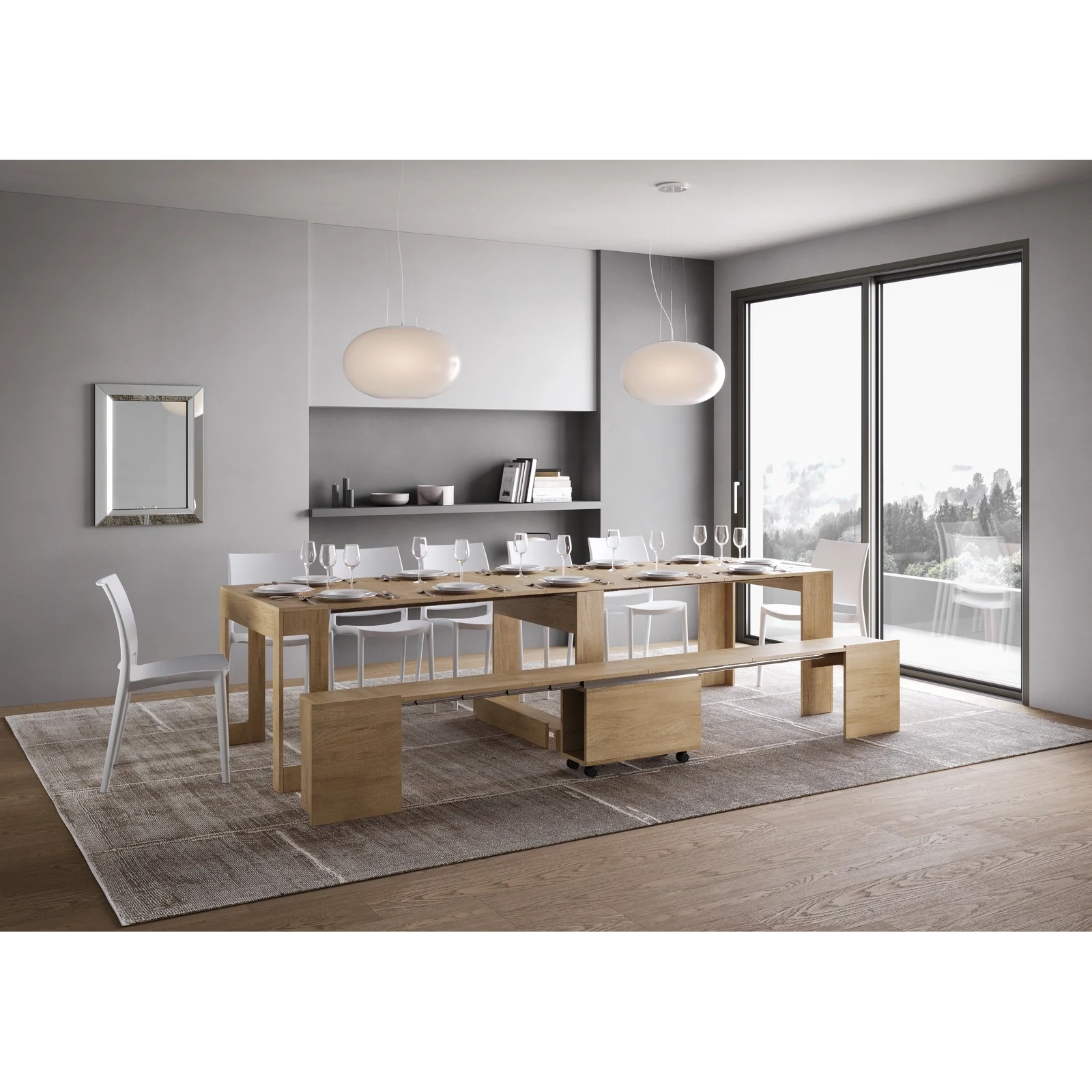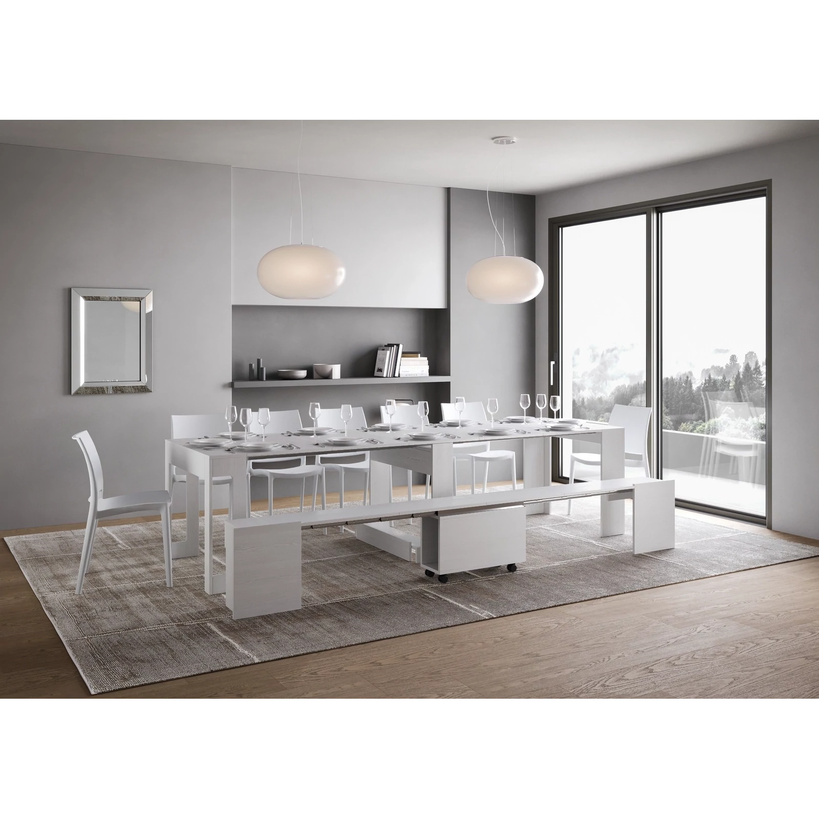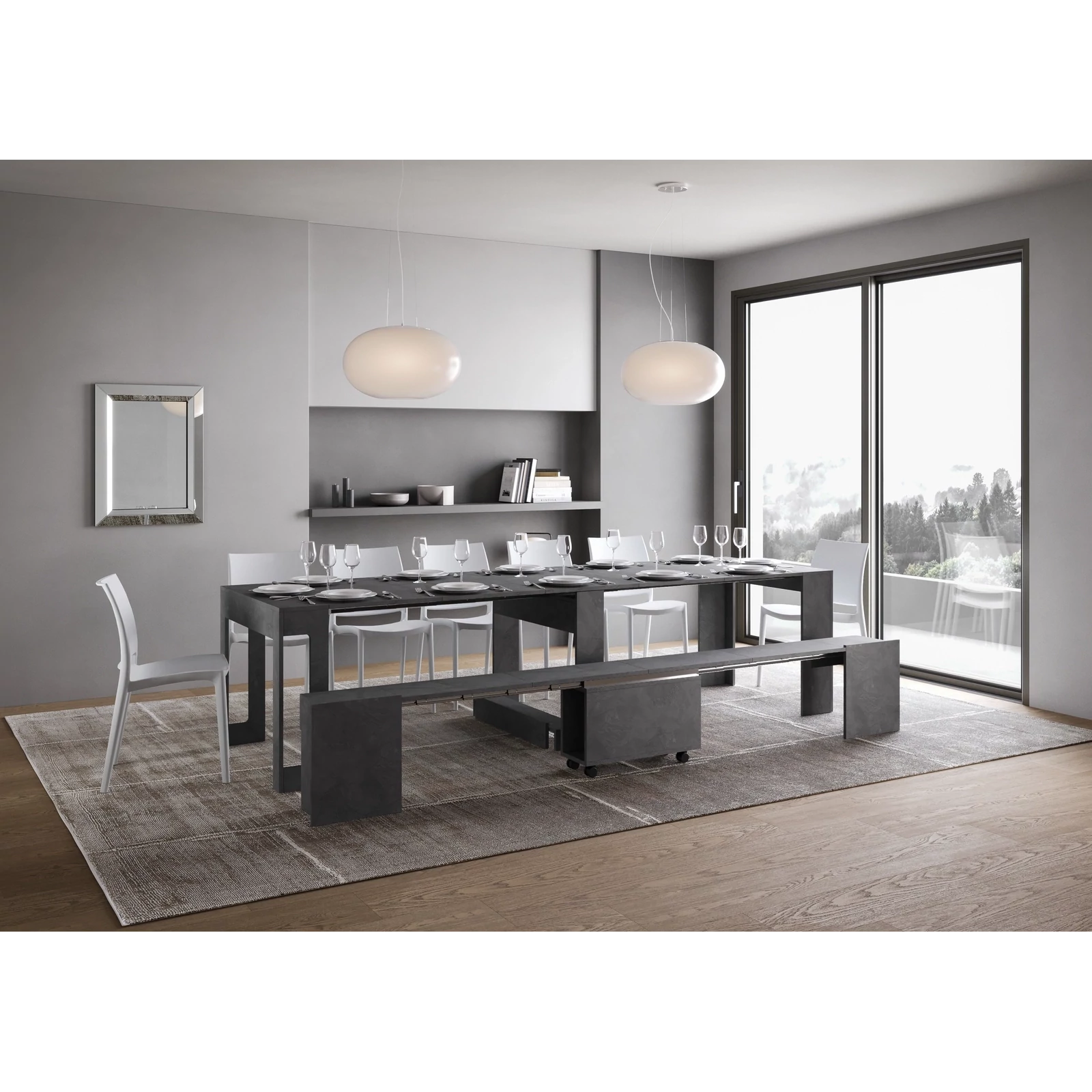 A sokoldalú és multifunkcionális Evolve konzolasztal kihúzható ülőpaddal ideális megoldás bármilyen környezetbe, mint például az előszoba, konyha, étkező, nappali vagy folyosó. Összecsukva a pad kisméretű, így a konzolasztal alatt tárolható, optimalizálva a tér- és felületkihasználást. Ha szükséges, a konzolasztal könnyedén kihúzható 302×90×75 cm-re, így nagy étkezőasztallá válik, amely akár 14 főnek is helyet ad. A pad is 300×72×45 cm-re bővíthető 4 bővítőelemmel (egyenként 57 cm), és akár 6 főnek is helyet biztosít. Melaminlapokból készült, a stabilitást a teleszkópos alumínium sínmechanizmus és az integrált központi támasztórendszer biztosítja. Összecsukott állapotban a konzolasztal és a pad bővítőlappjai is a saját szerkezetükben tárolhatók. A pad praktikus forgó kerekekkel van ellátva, így könnyen mozgatható.