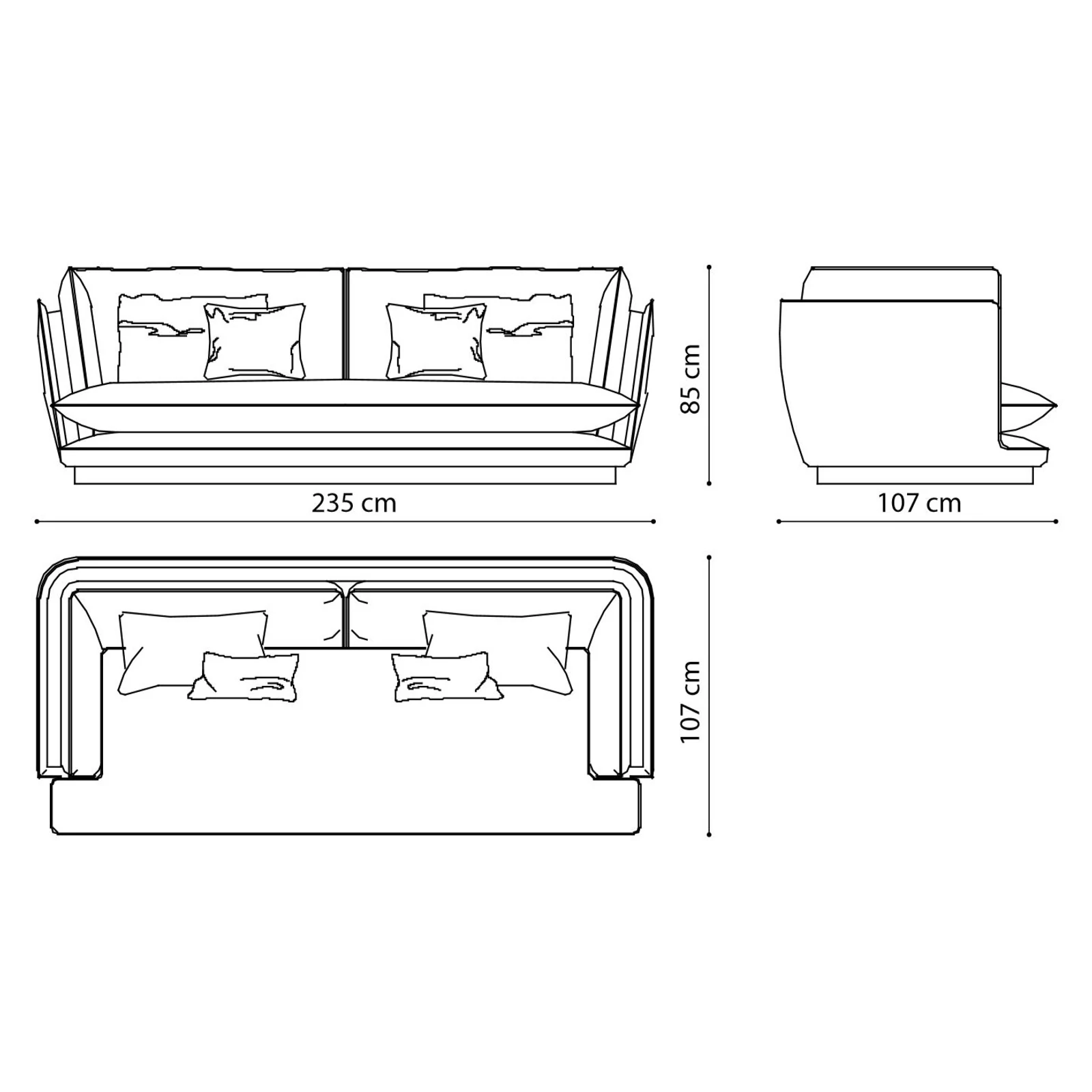 A kanapék és fotelek külső burkolata teljesen körülöleli a puha belső párnázatot, kiemelve az elemek különböző méreteit és az anyagok puhaságát, valamint az ülőrész formáját és kényelmességét. A széleket kontrasztos szövetből felvarrt szegélyek díszítik, melyek színe az anyagminták közül kiválasztva személyre szabható. Alsó részüket fényes fém lábazat szegélyezi, ezzel egy kis ragyogást kölcsönözve a bútordaraboknak, ami mindenki tekintetét odacsábítja.
