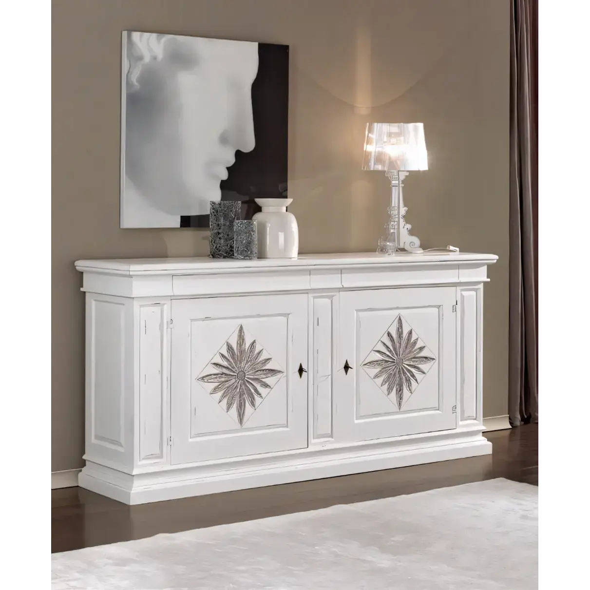 Morello klasszikus stílusú tálalószekrény, 2 ajtós, 2 fiókkal, faragott virágos díszítéssel