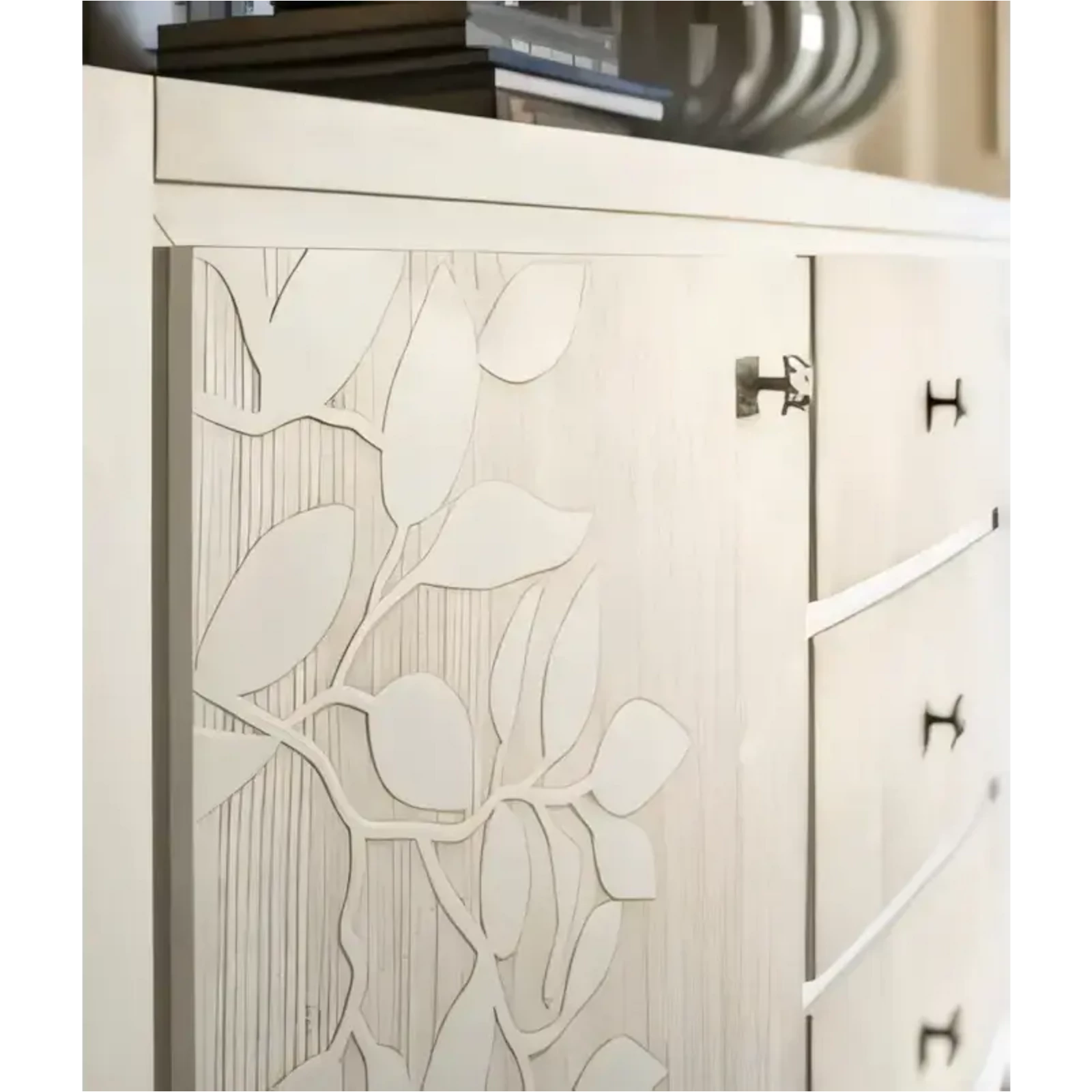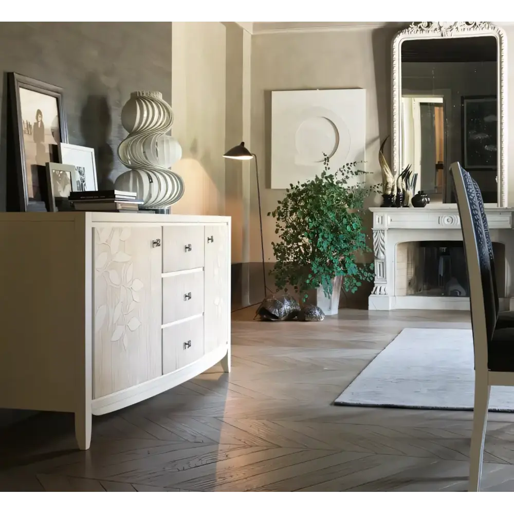 Morello modern stílusú tálalószekrény, 2 ajtós, 3 fiókkal, levélmintás díszítéssel