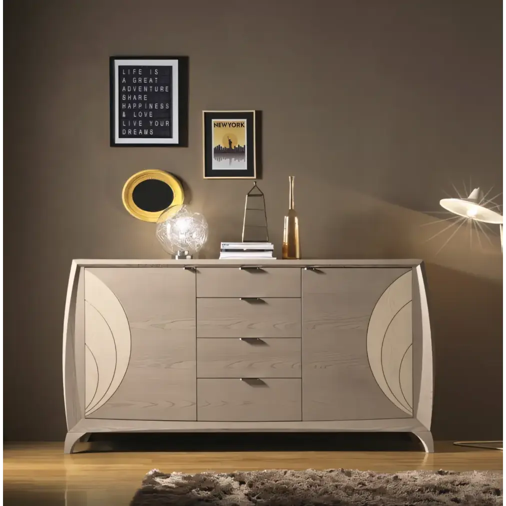 Morello modern stílusú tálalószekrény, 2 ajtós, 4 fiókkal, faragott díszítéssel
