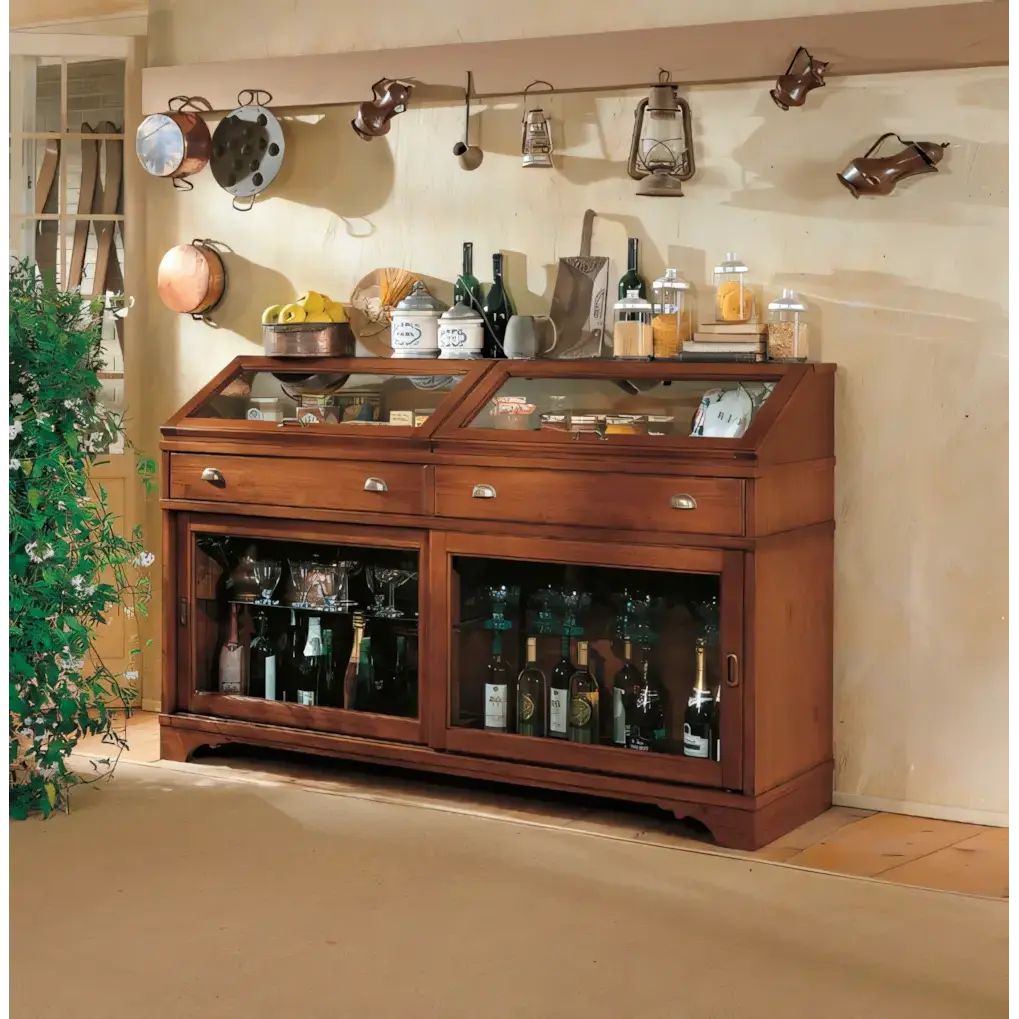 Morello klasszikus stílusú tálalószekrény, 2 tolóajtós, 2 felnyitható üvegajtóval, 2 fiókkal