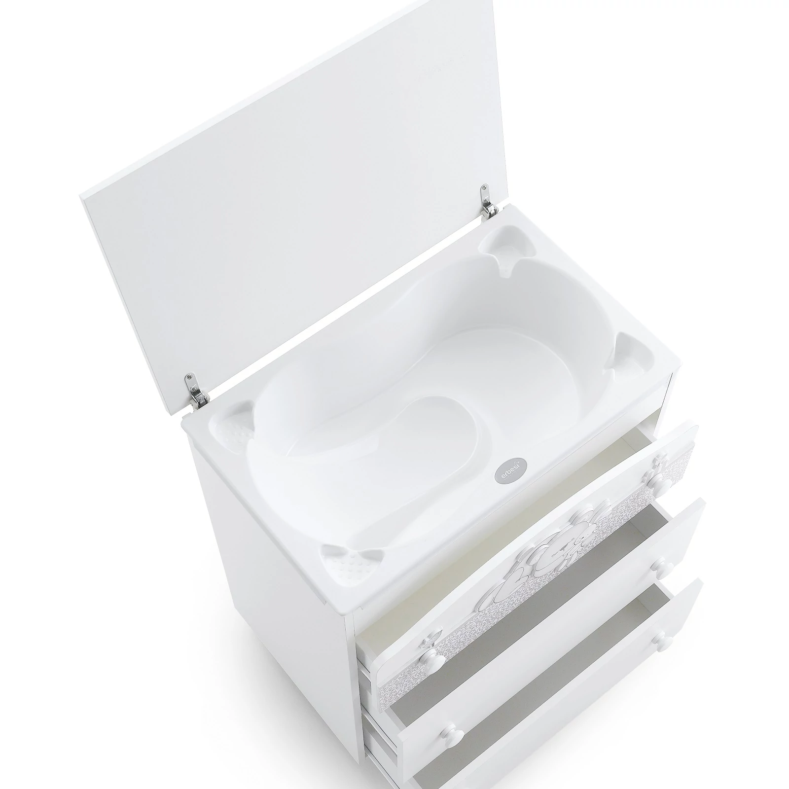 Minden Erbesi babakád E1-es osztályú, alacsony kibocsátású PVC-anyaggal borított forgácslapból, a fogantyúk pedig tömör bükkfából készülnek. A négy görgő nem hagy nyomot a padlón, közülük kettő fékkel van ellátva. A babakád hátsó panele erős, sűrű forgácslapból készül a nagyobb stabilitás érdekében. Az anatómiai csúszásmentes kád könnyed mozdulatokat tesz lehetővé, valamint négy darab, kényelmesen hozzáférhető szappantartórésszel van ellátva. A felső rész két zsanérja speciális rugókkal rendelkezik a nagyobb biztonság érdekében. A kisgyermek kényelmét szem előtt tartva a pelenkázórész puha PVC-anyaggal van bevonva.