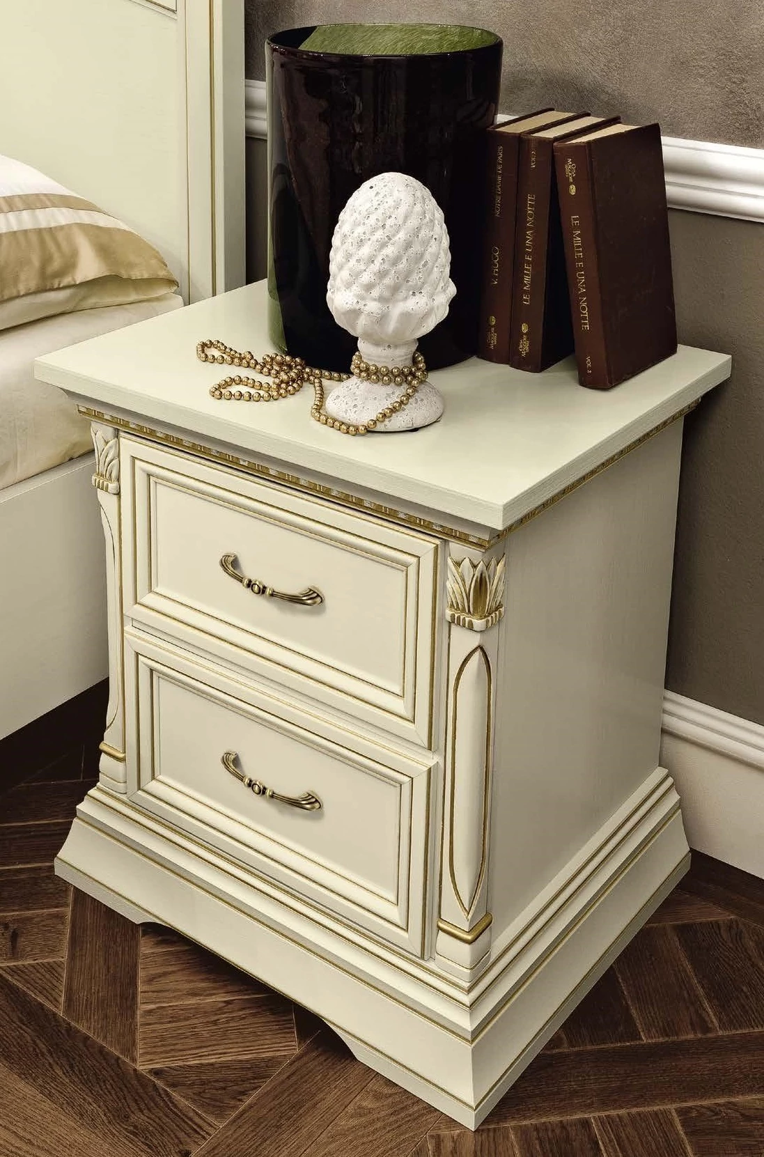 A furnérozott, vastag (25-30 mm!) fedlapok oldalán gyönyörű, keményfába faragott díszítés látható szinte minden bútoron. A konvex formájú, egészen egyedi jelleget biztosító fedlapok kerete mind tömörfából készül, mely garantálja az akár évtizedes időtállóságot. A mai világban egészen ritka módon az összes antikolást kézzel végzik az észak-olaszországi, évszázados hagyományra visszatekintő szakemberek. Válogasson kedvére ebből a meseszép kollekcióból: mivel a modell bármely eleme külön is rendelhető, bármekkora méretű tér könnyedén berendezhető vele. Ha nem találja, amit keres, vagy bármilyen kérdése van, kollégáink szívesen állnak rendelkezésére elérhetőségeinken!
