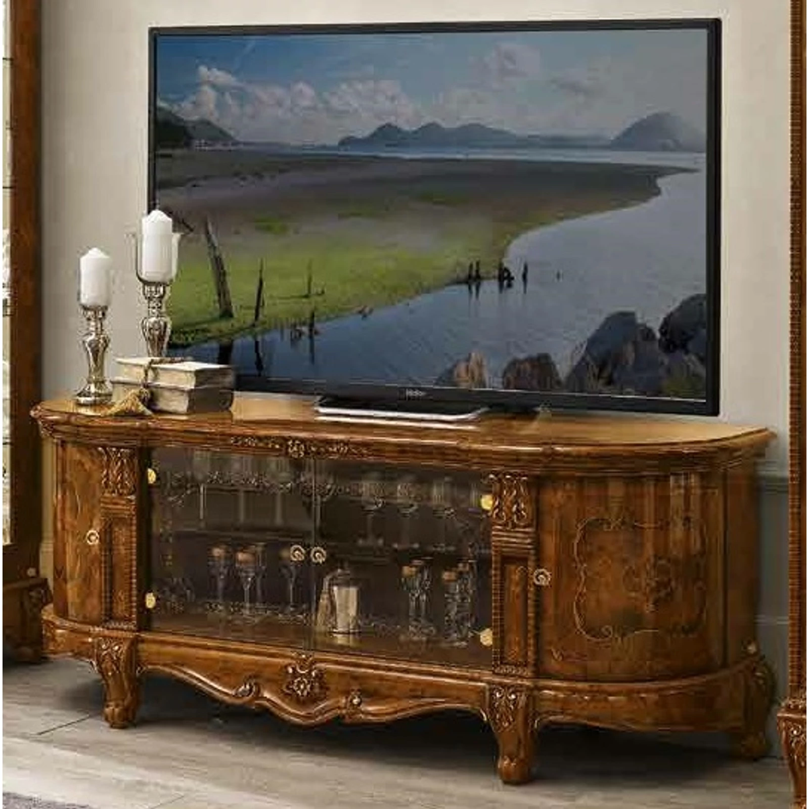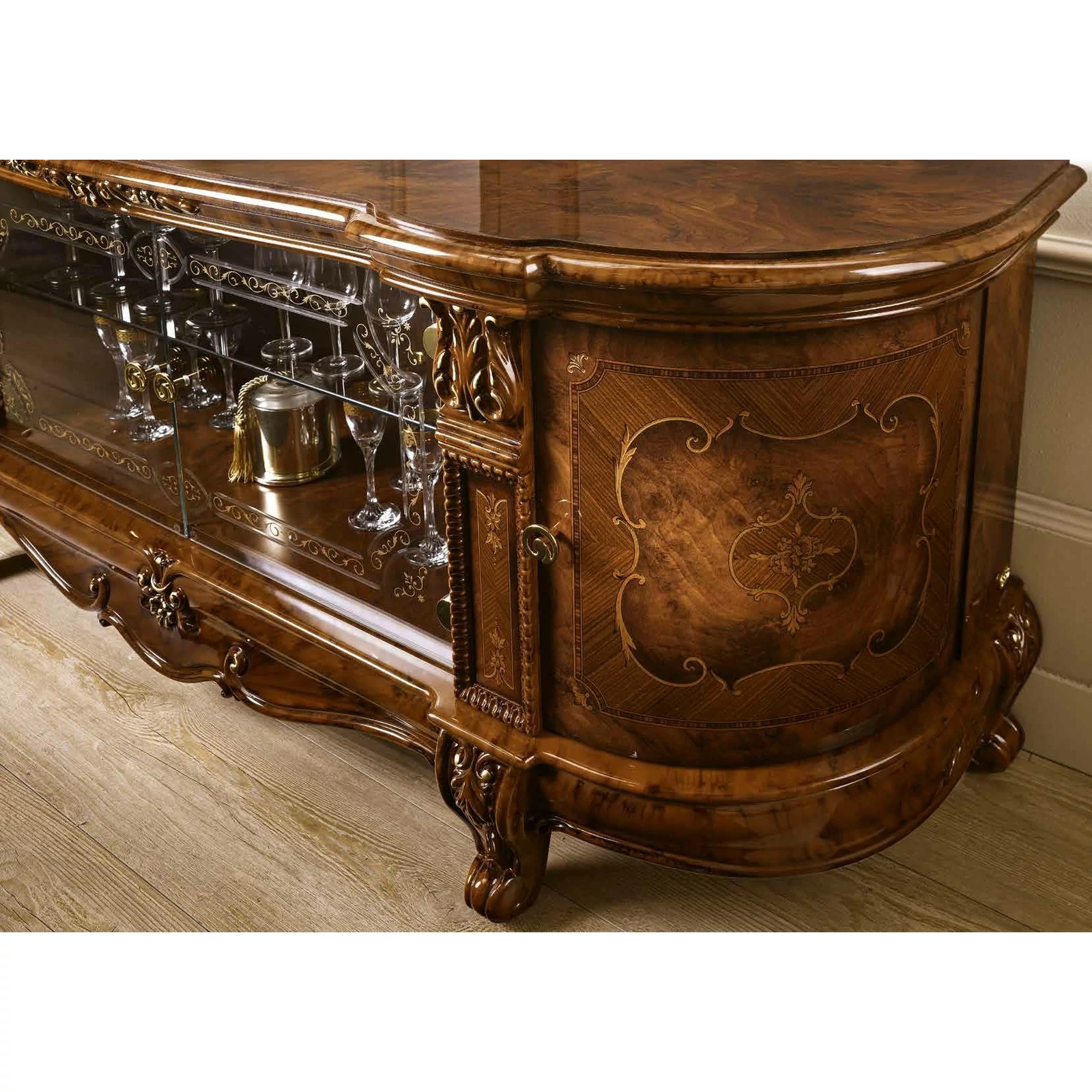 A sötét dió árnyalatú bútorelemek egytől egyig magas szintű kézműipari szaktudásról árulkodnak, amely észrevehető az egész környezet hatásán, valamint az apró dekoratív részleteken is.
